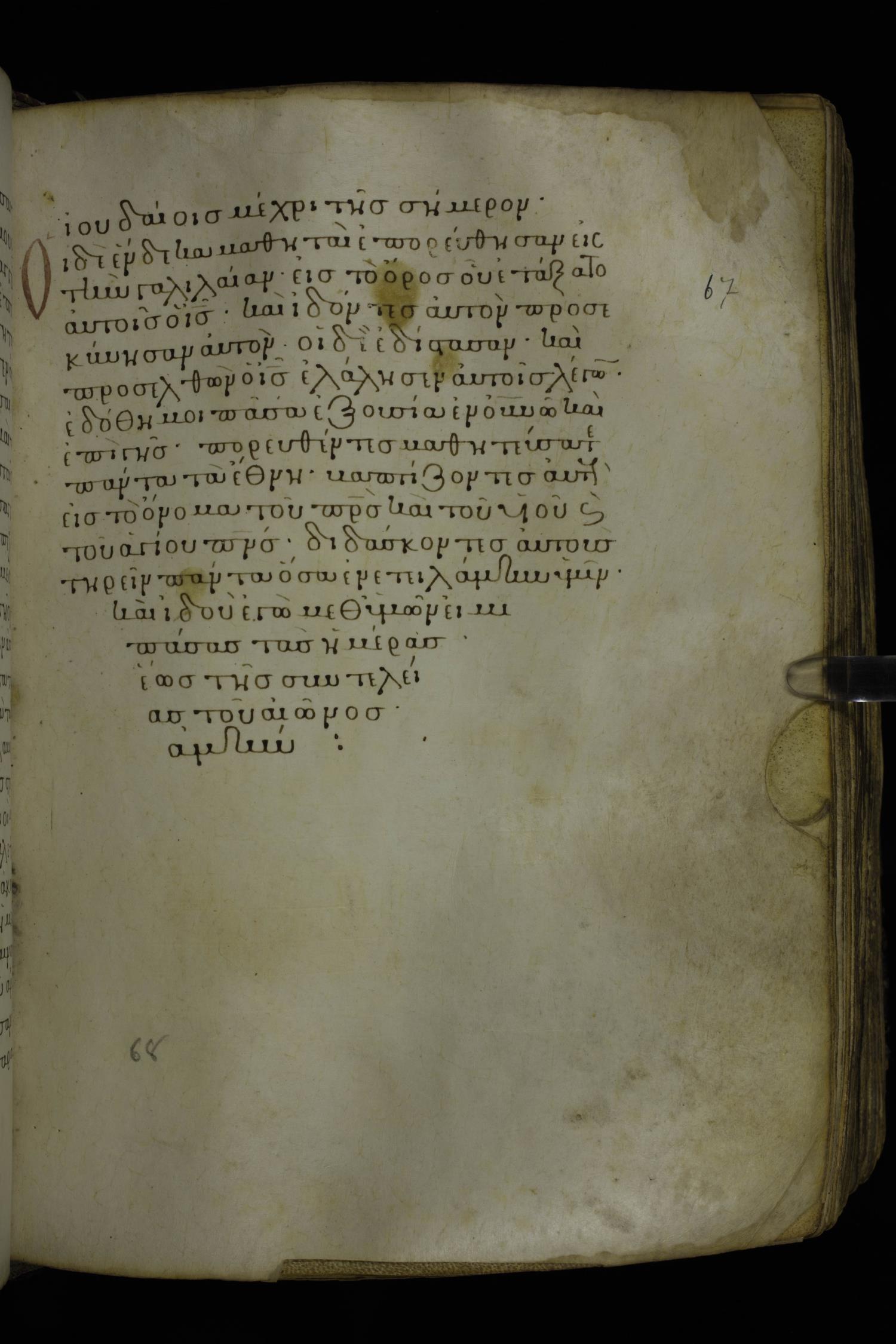 Twelfth century minuscule of the Gospels on parchment; 230 leaves, 1 column, 24-26 lines per column. Images were taken at the National Library of Greece in Athens.