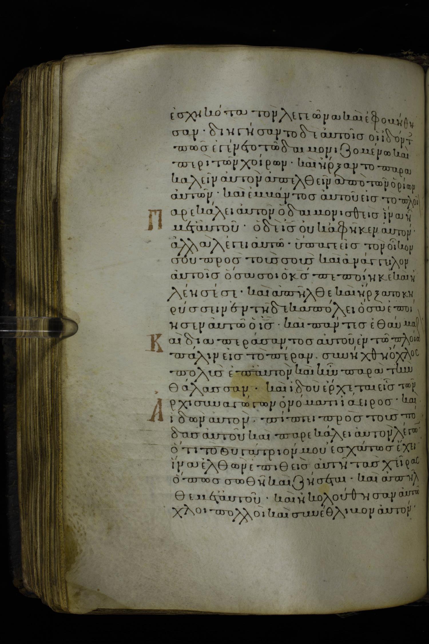 Twelfth century minuscule of the Gospels on parchment; 230 leaves, 1 column, 24-26 lines per column. Images were taken at the National Library of Greece in Athens.