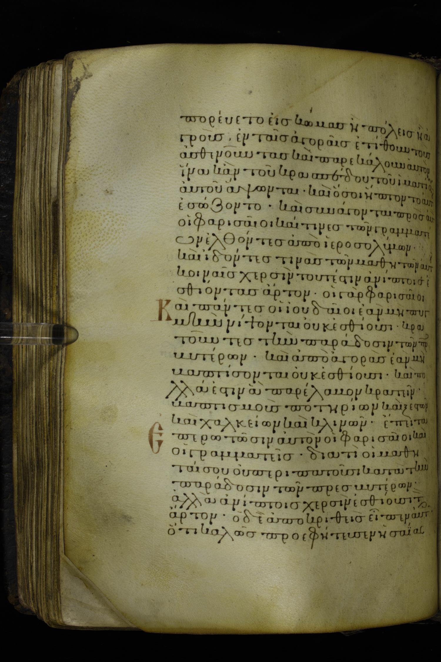 Twelfth century minuscule of the Gospels on parchment; 230 leaves, 1 column, 24-26 lines per column. Images were taken at the National Library of Greece in Athens.