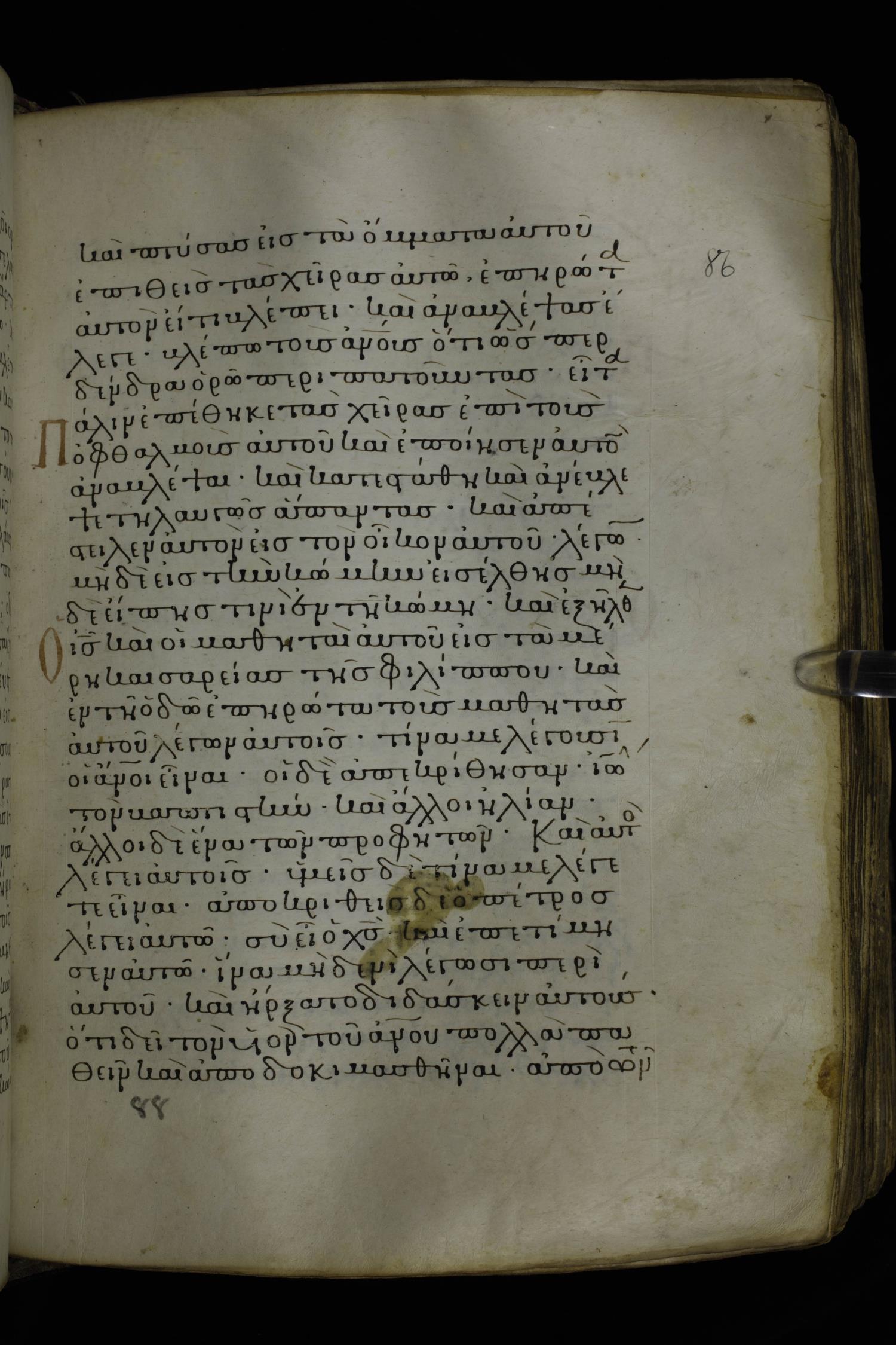Twelfth century minuscule of the Gospels on parchment; 230 leaves, 1 column, 24-26 lines per column. Images were taken at the National Library of Greece in Athens.