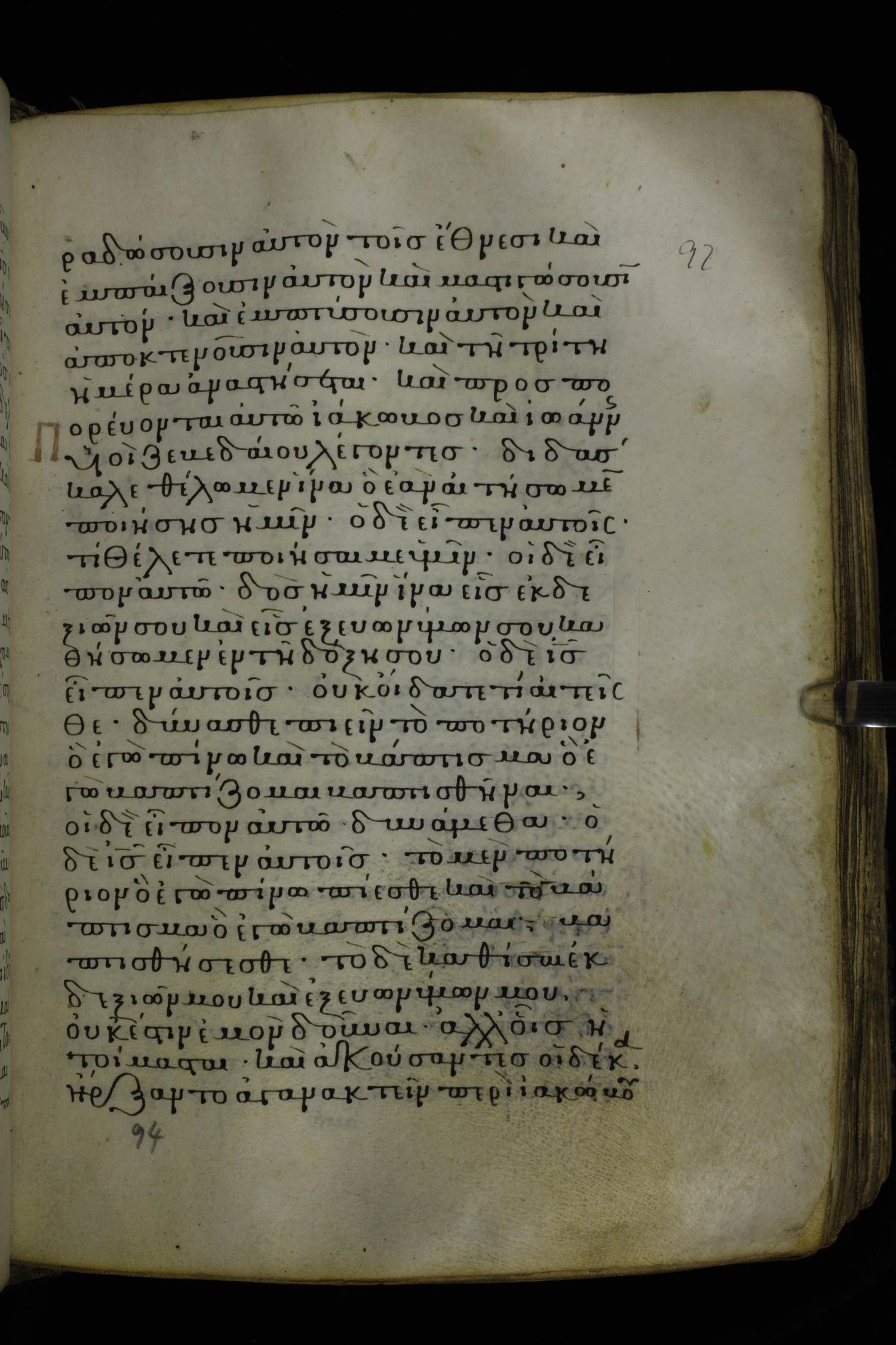 Twelfth century minuscule of the Gospels on parchment; 230 leaves, 1 column, 24-26 lines per column. Images were taken at the National Library of Greece in Athens.