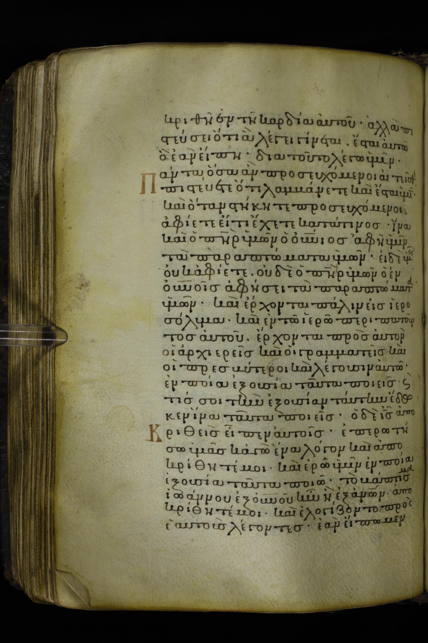 Twelfth century minuscule of the Gospels on parchment; 230 leaves, 1 column, 24-26 lines per column. Images were taken at the National Library of Greece in Athens.