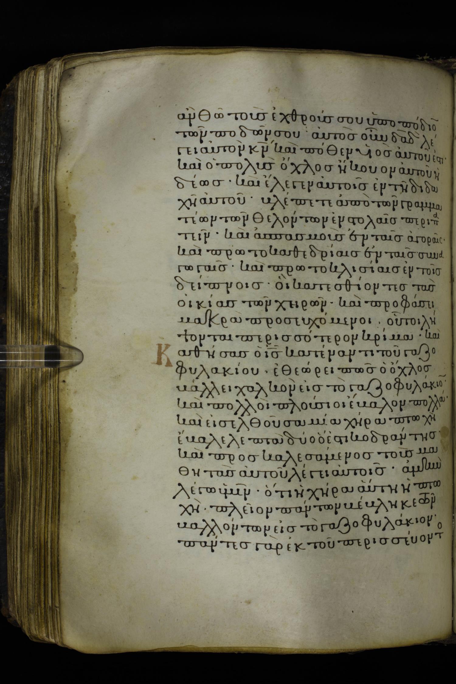 Twelfth century minuscule of the Gospels on parchment; 230 leaves, 1 column, 24-26 lines per column. Images were taken at the National Library of Greece in Athens.