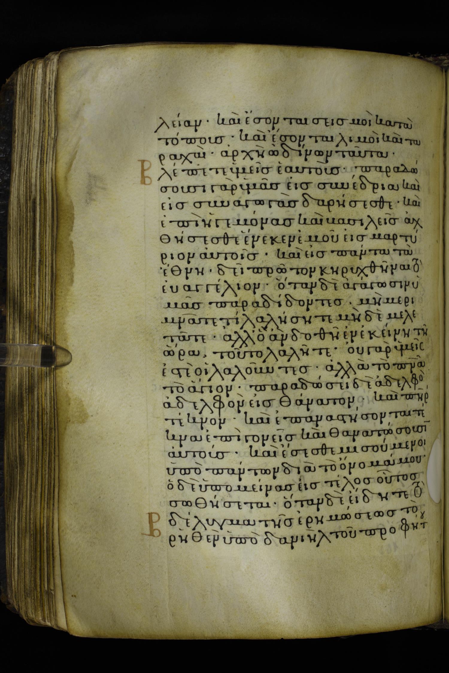 Twelfth century minuscule of the Gospels on parchment; 230 leaves, 1 column, 24-26 lines per column. Images were taken at the National Library of Greece in Athens.
