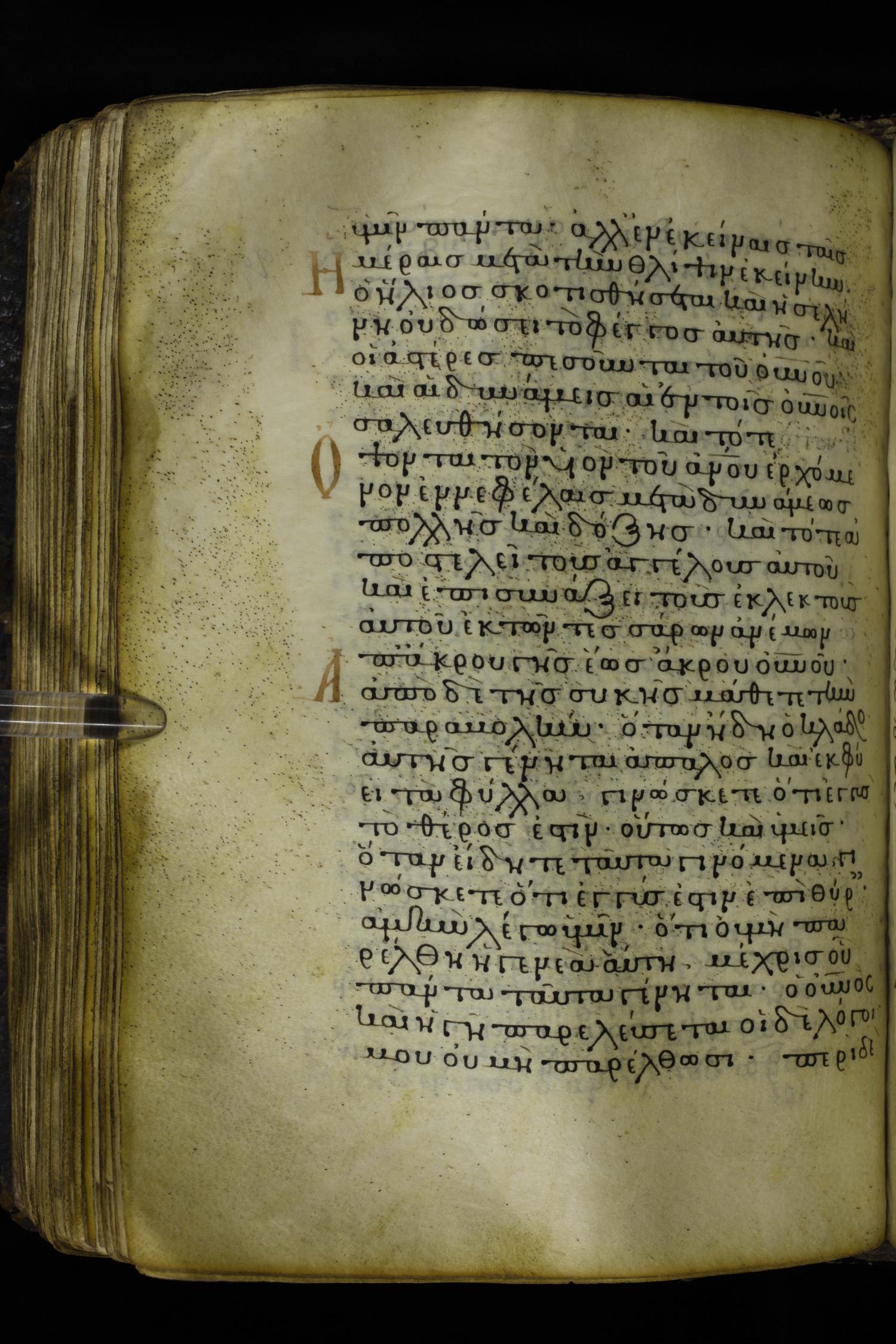Twelfth century minuscule of the Gospels on parchment; 230 leaves, 1 column, 24-26 lines per column. Images were taken at the National Library of Greece in Athens.