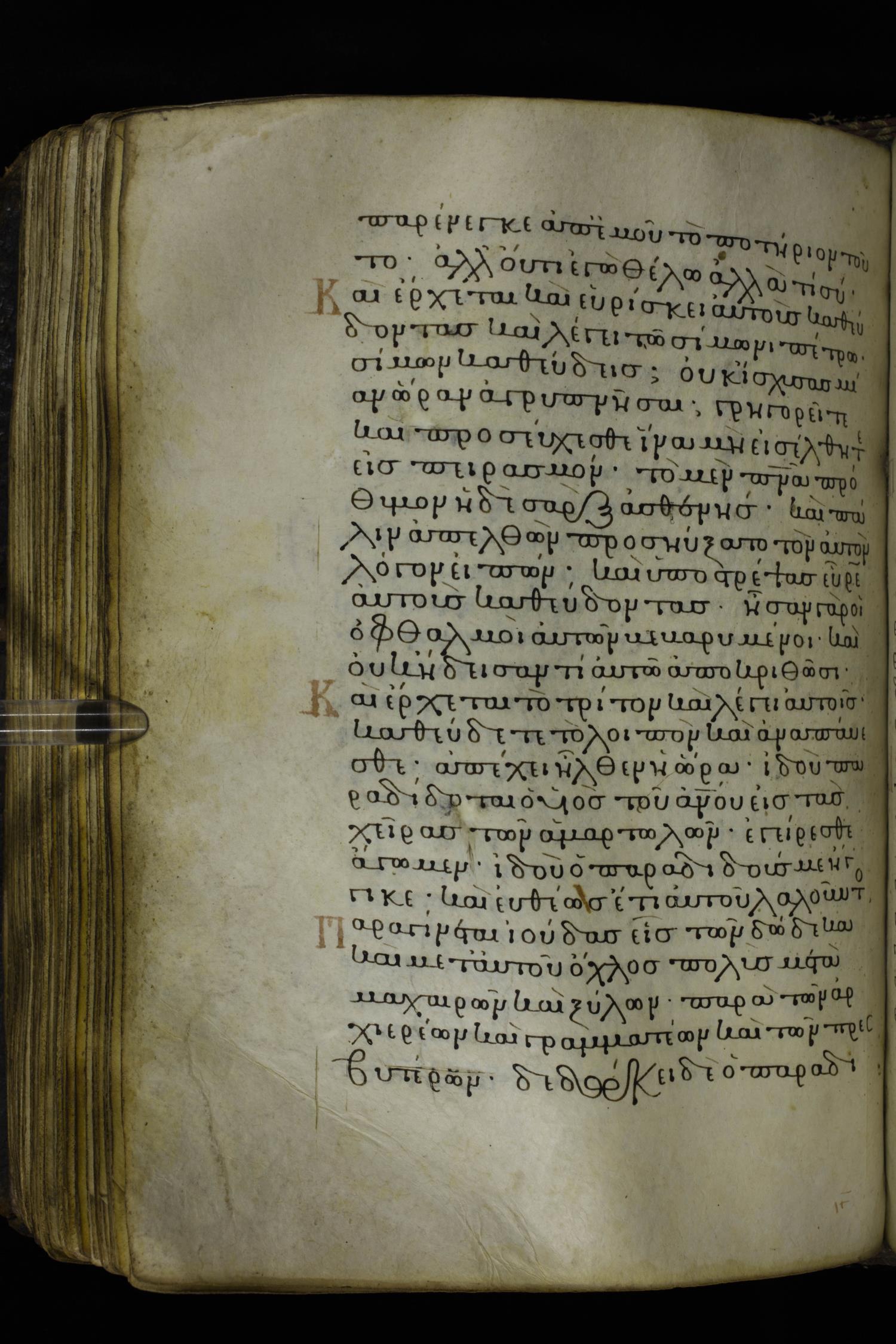 Twelfth century minuscule of the Gospels on parchment; 230 leaves, 1 column, 24-26 lines per column. Images were taken at the National Library of Greece in Athens.