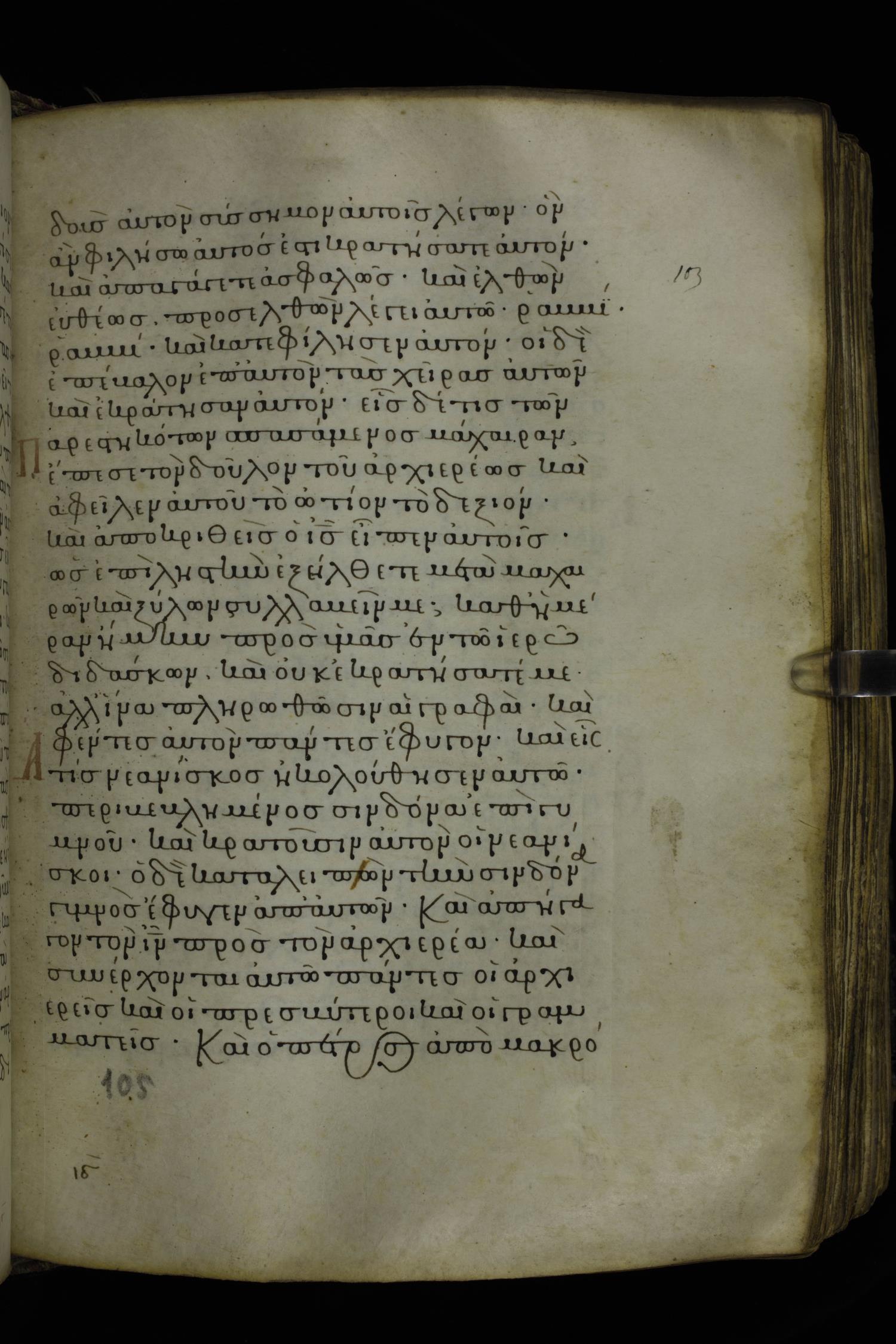 Twelfth century minuscule of the Gospels on parchment; 230 leaves, 1 column, 24-26 lines per column. Images were taken at the National Library of Greece in Athens.