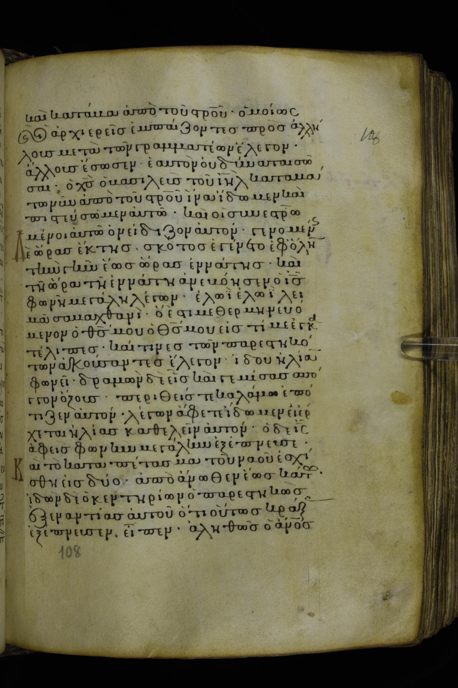 Twelfth century minuscule of the Gospels on parchment; 230 leaves, 1 column, 24-26 lines per column. Images were taken at the National Library of Greece in Athens.