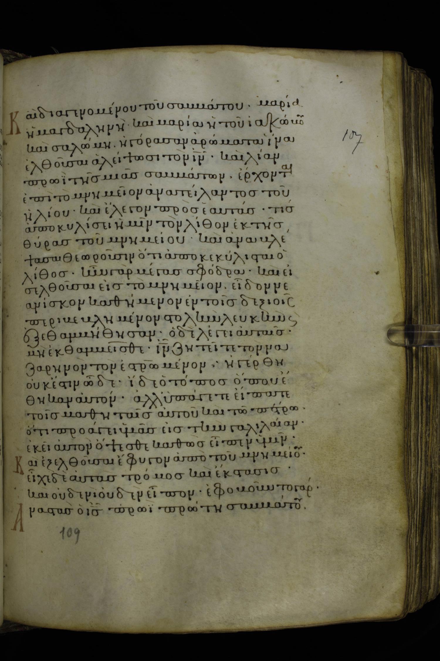 Twelfth century minuscule of the Gospels on parchment; 230 leaves, 1 column, 24-26 lines per column. Images were taken at the National Library of Greece in Athens.