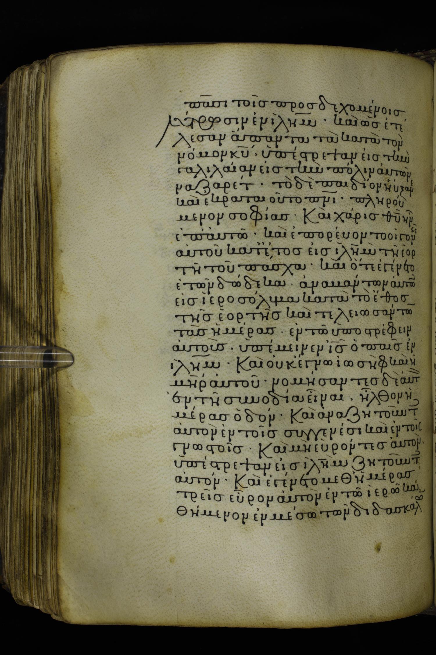 Twelfth century minuscule of the Gospels on parchment; 230 leaves, 1 column, 24-26 lines per column. Images were taken at the National Library of Greece in Athens.