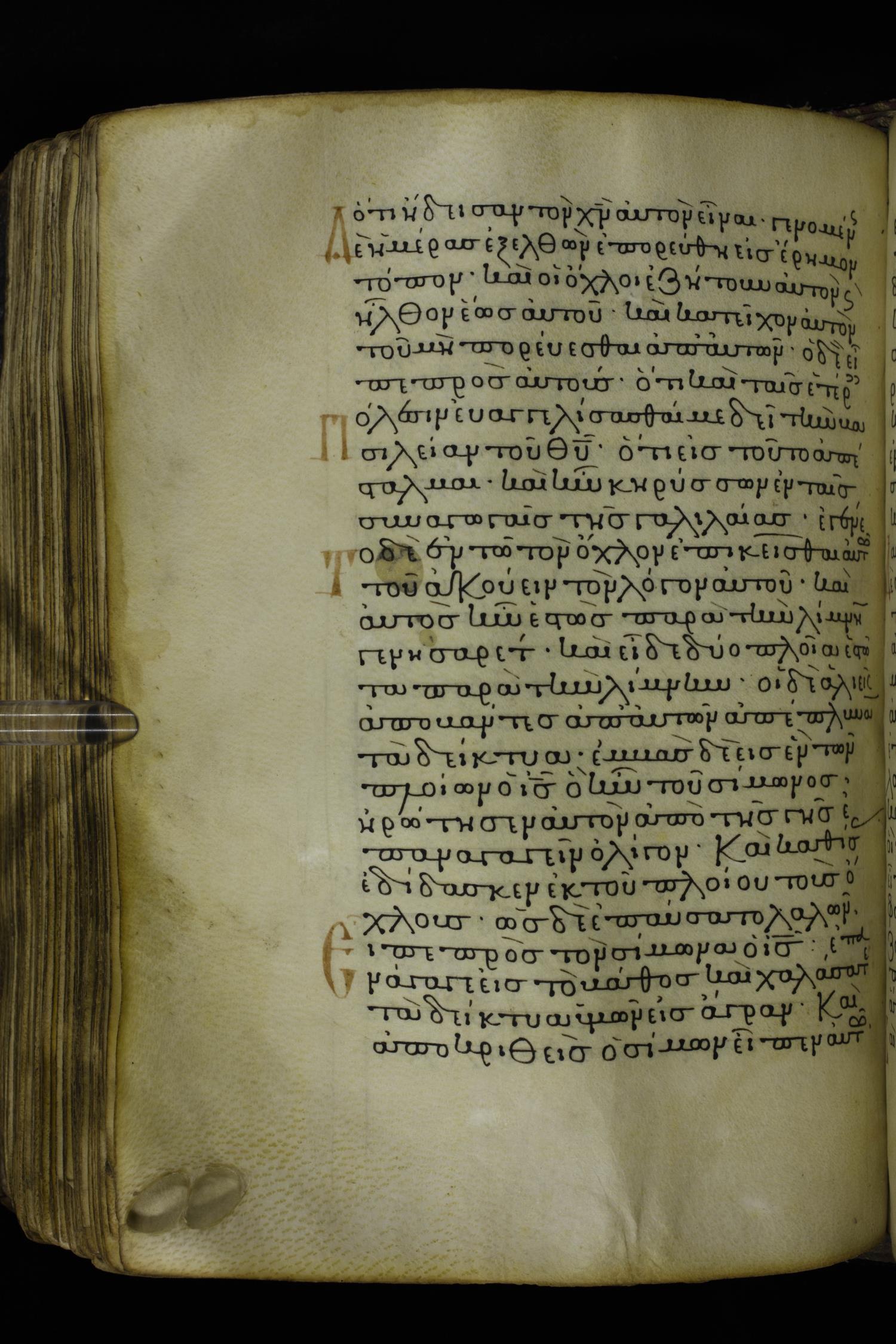 Twelfth century minuscule of the Gospels on parchment; 230 leaves, 1 column, 24-26 lines per column. Images were taken at the National Library of Greece in Athens.