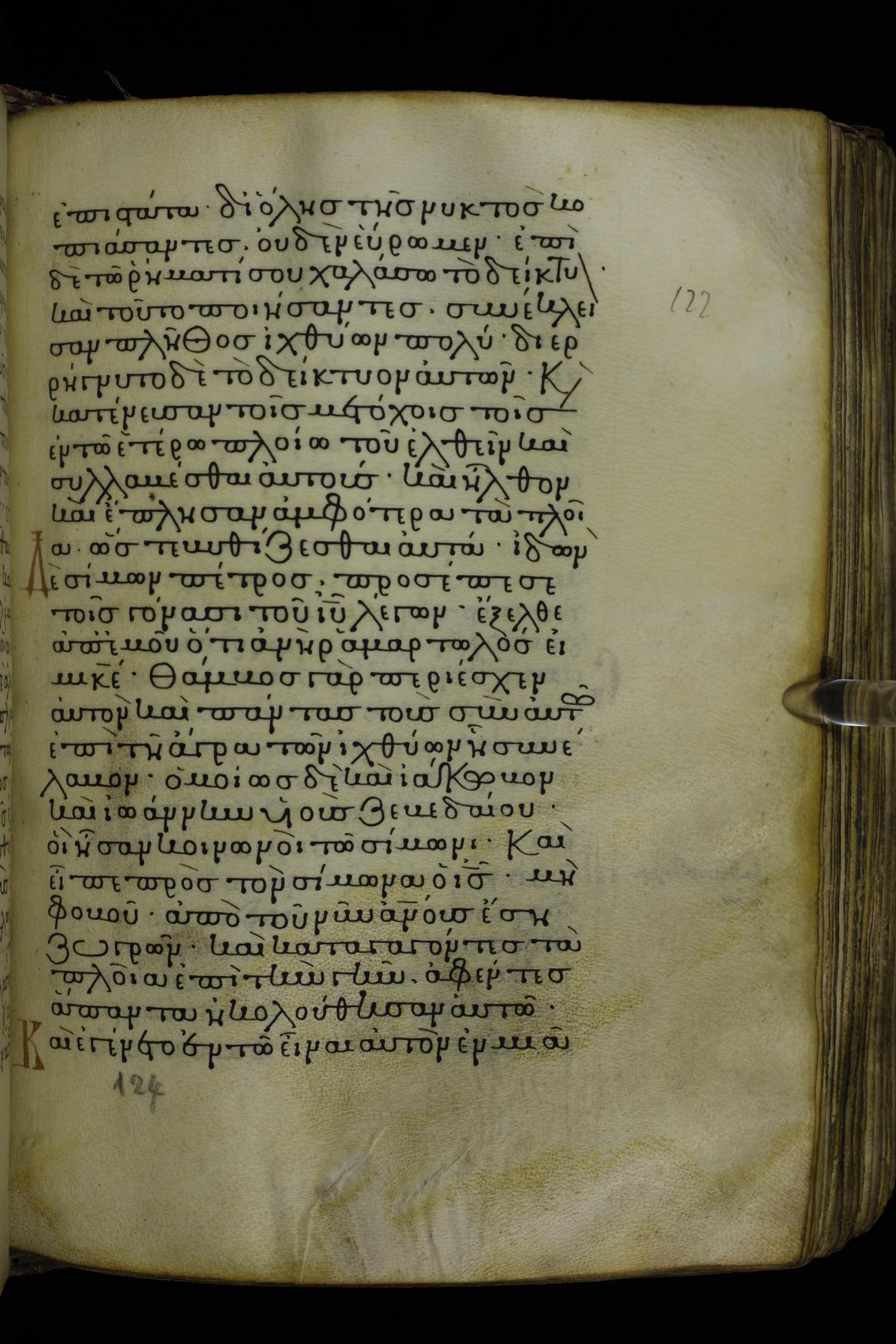 Twelfth century minuscule of the Gospels on parchment; 230 leaves, 1 column, 24-26 lines per column. Images were taken at the National Library of Greece in Athens.