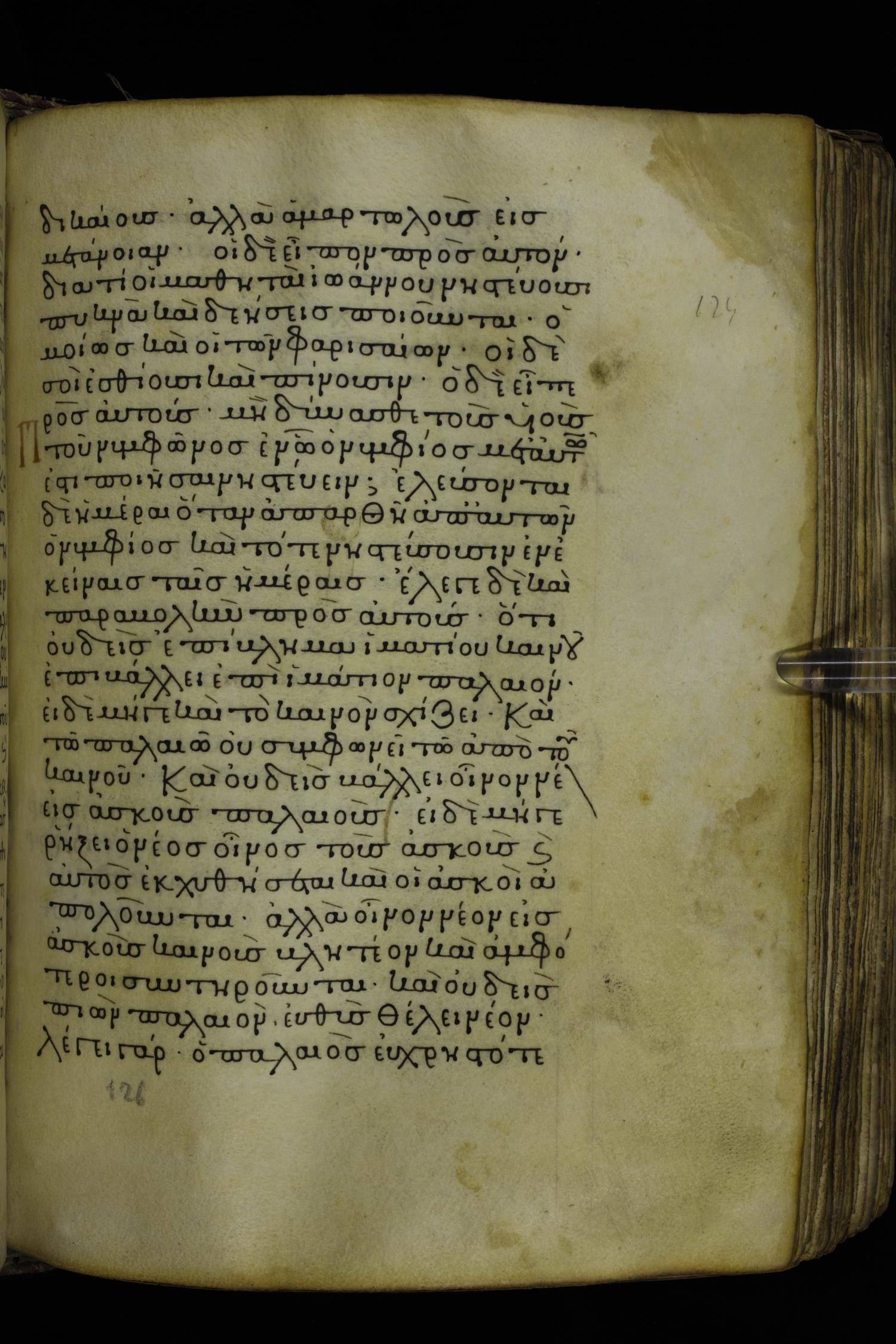 Twelfth century minuscule of the Gospels on parchment; 230 leaves, 1 column, 24-26 lines per column. Images were taken at the National Library of Greece in Athens.
