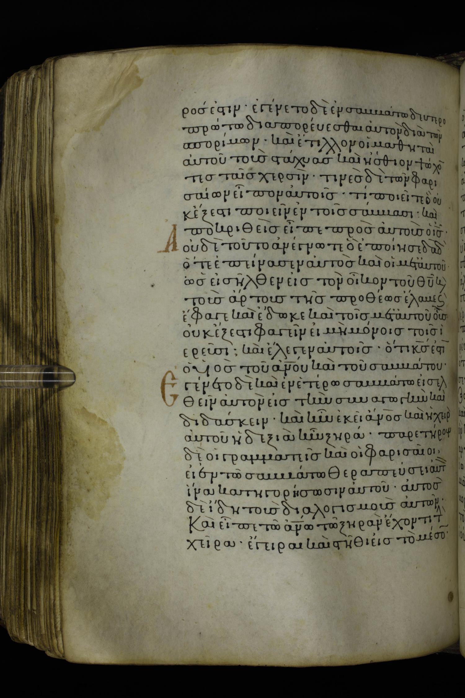 Twelfth century minuscule of the Gospels on parchment; 230 leaves, 1 column, 24-26 lines per column. Images were taken at the National Library of Greece in Athens.