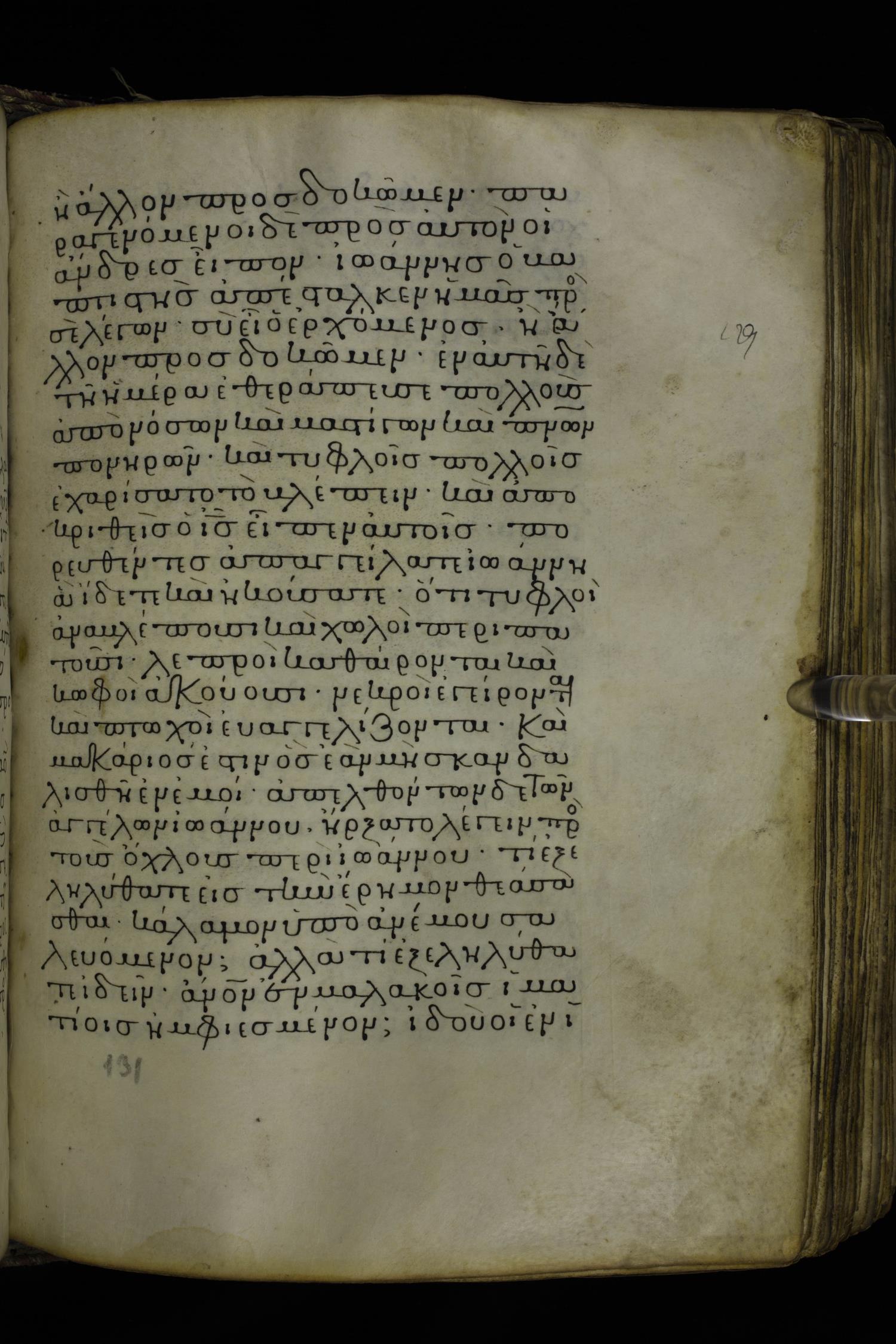 Twelfth century minuscule of the Gospels on parchment; 230 leaves, 1 column, 24-26 lines per column. Images were taken at the National Library of Greece in Athens.