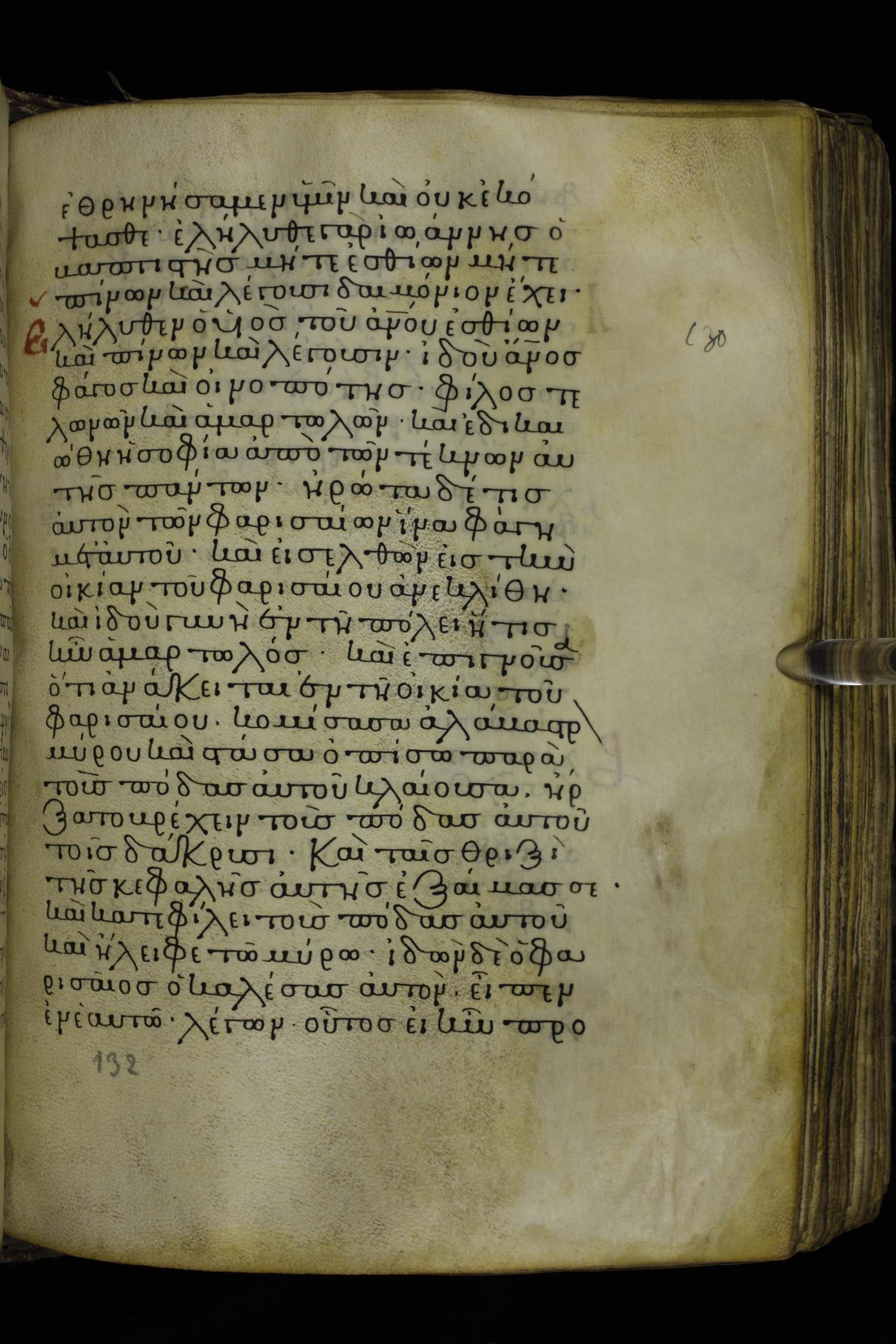 Twelfth century minuscule of the Gospels on parchment; 230 leaves, 1 column, 24-26 lines per column. Images were taken at the National Library of Greece in Athens.