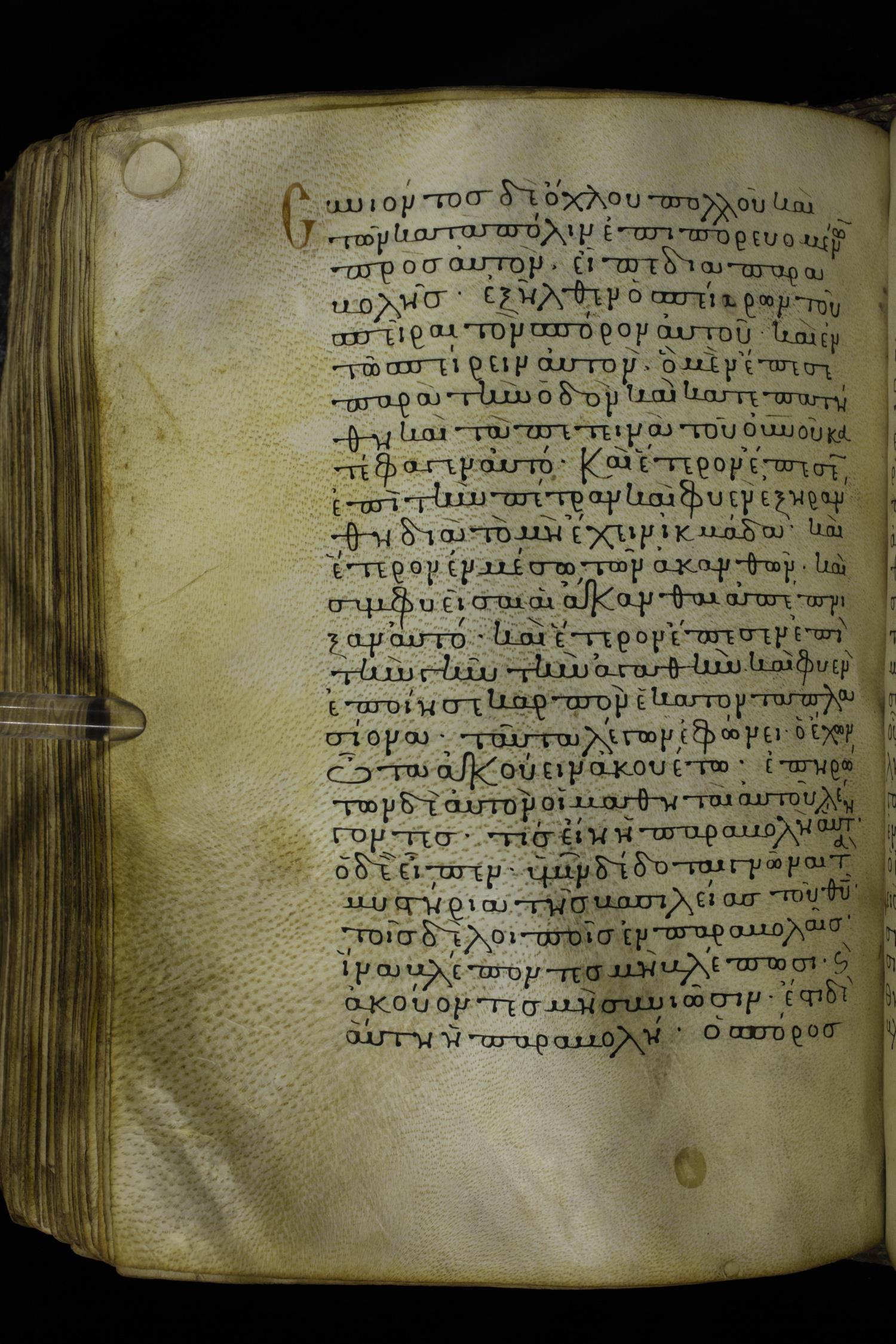 Twelfth century minuscule of the Gospels on parchment; 230 leaves, 1 column, 24-26 lines per column. Images were taken at the National Library of Greece in Athens.