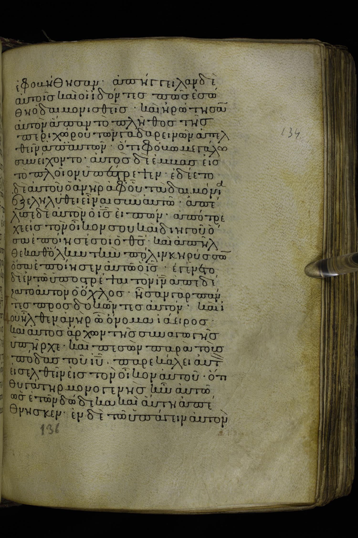 Twelfth century minuscule of the Gospels on parchment; 230 leaves, 1 column, 24-26 lines per column. Images were taken at the National Library of Greece in Athens.