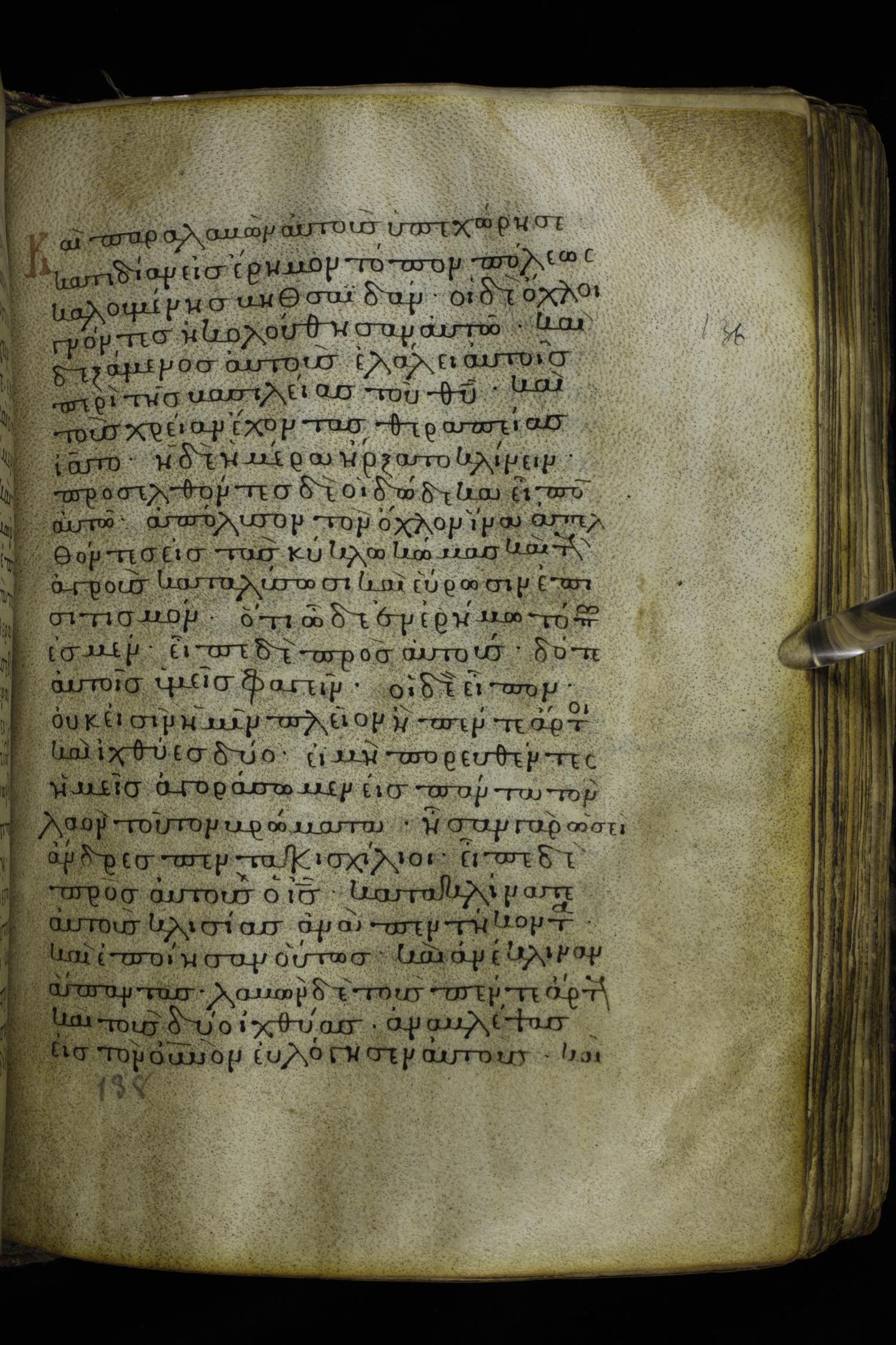Twelfth century minuscule of the Gospels on parchment; 230 leaves, 1 column, 24-26 lines per column. Images were taken at the National Library of Greece in Athens.