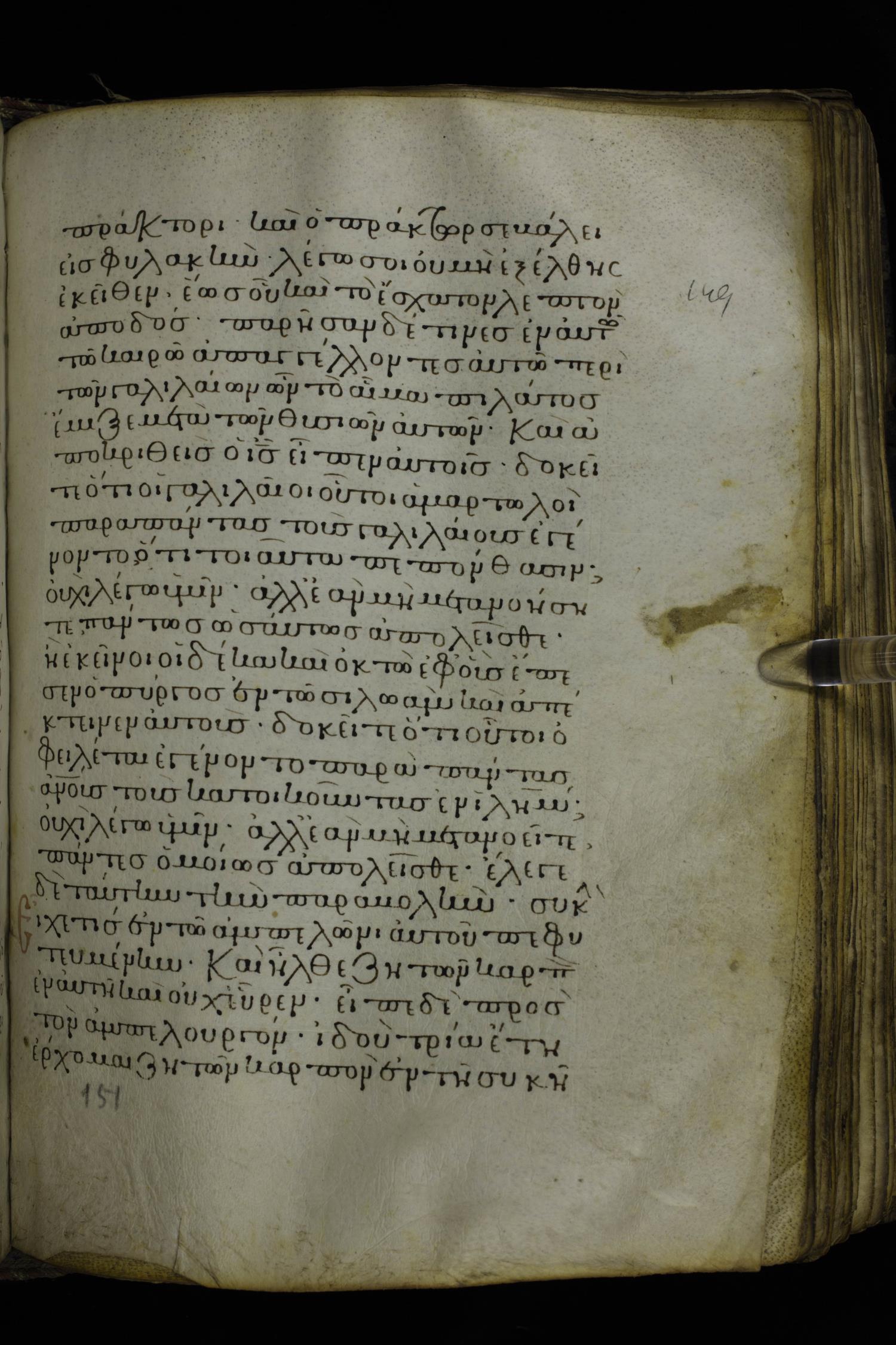 Twelfth century minuscule of the Gospels on parchment; 230 leaves, 1 column, 24-26 lines per column. Images were taken at the National Library of Greece in Athens.