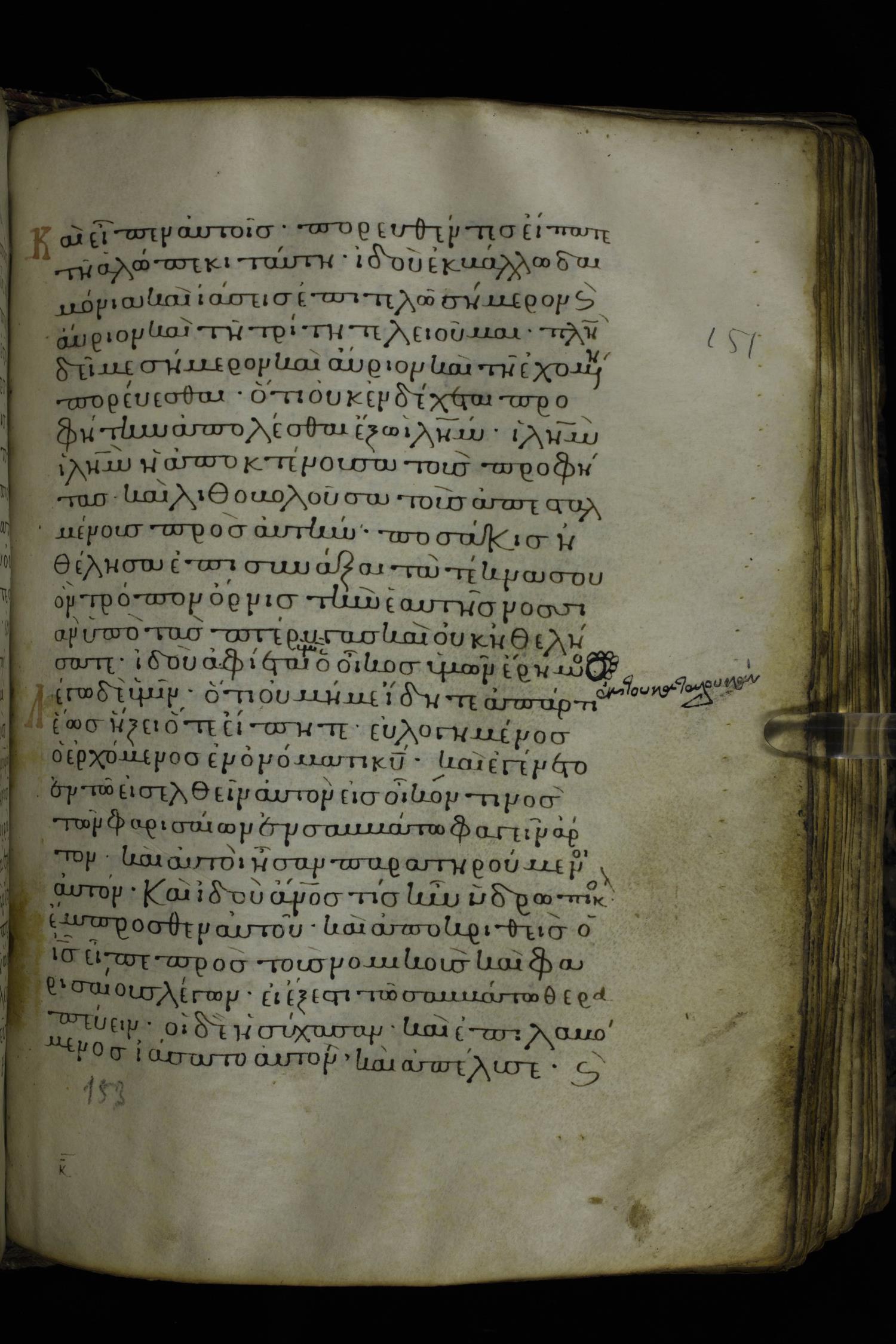Twelfth century minuscule of the Gospels on parchment; 230 leaves, 1 column, 24-26 lines per column. Images were taken at the National Library of Greece in Athens.