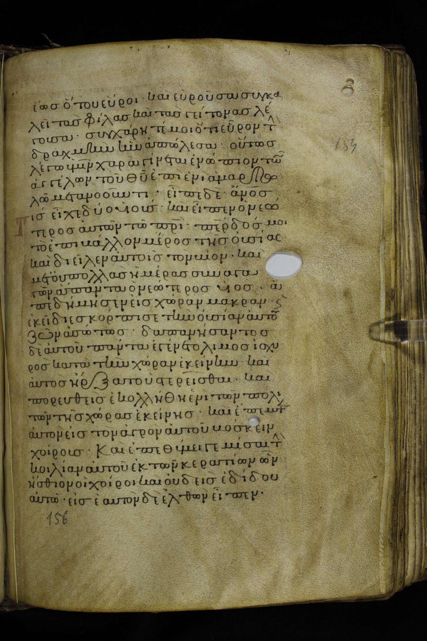 Twelfth century minuscule of the Gospels on parchment; 230 leaves, 1 column, 24-26 lines per column. Images were taken at the National Library of Greece in Athens.