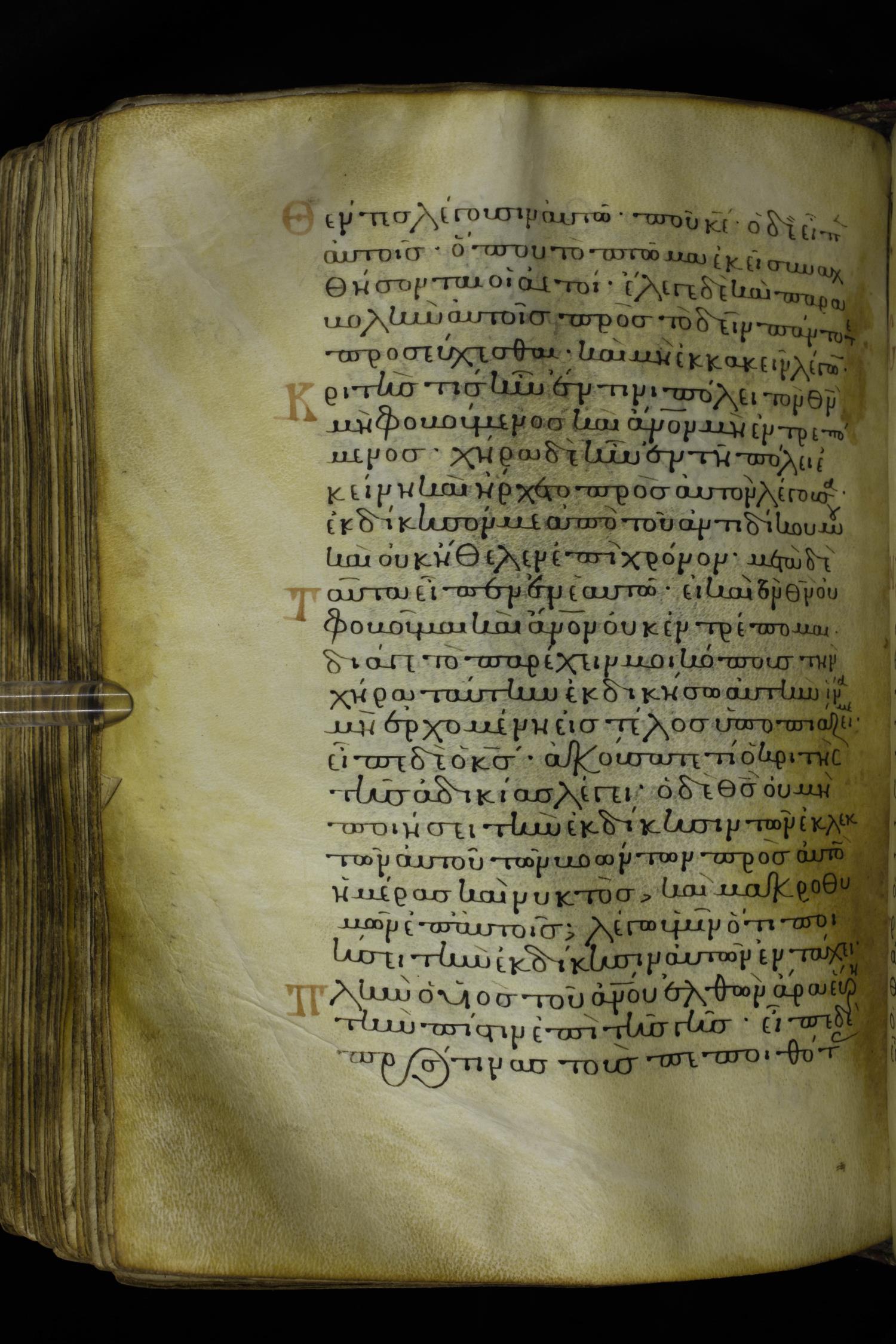 Twelfth century minuscule of the Gospels on parchment; 230 leaves, 1 column, 24-26 lines per column. Images were taken at the National Library of Greece in Athens.