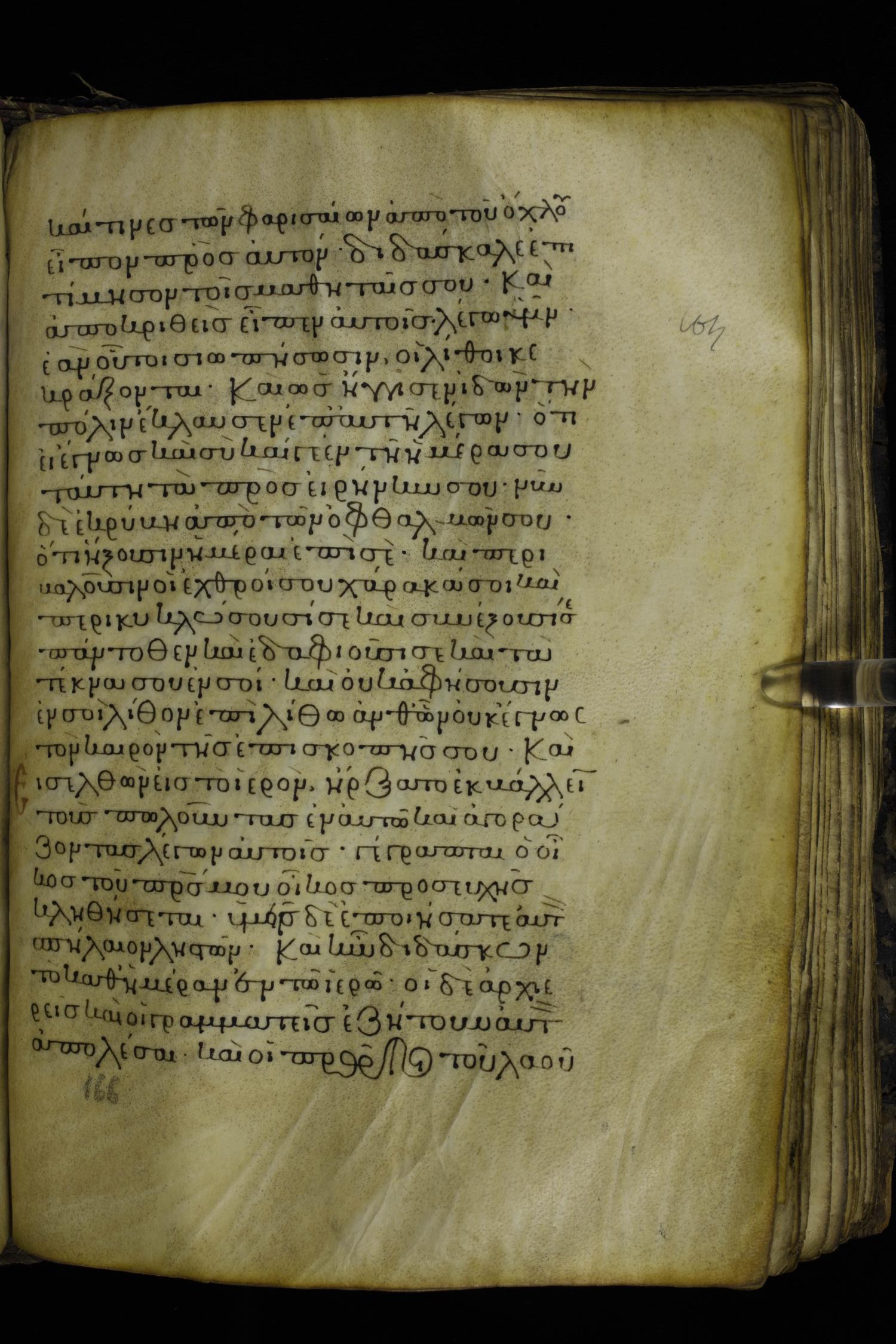 Twelfth century minuscule of the Gospels on parchment; 230 leaves, 1 column, 24-26 lines per column. Images were taken at the National Library of Greece in Athens.