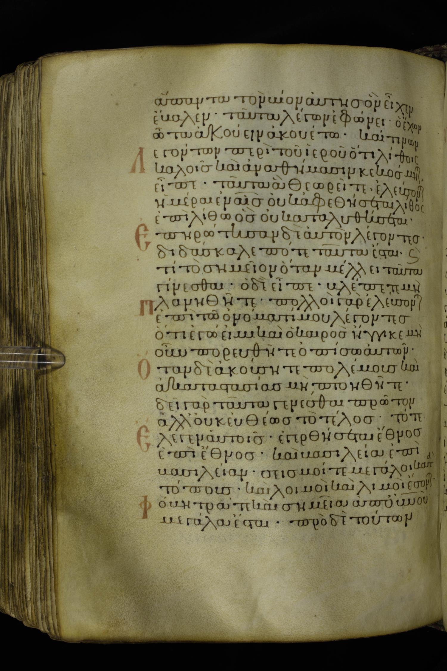 Twelfth century minuscule of the Gospels on parchment; 230 leaves, 1 column, 24-26 lines per column. Images were taken at the National Library of Greece in Athens.