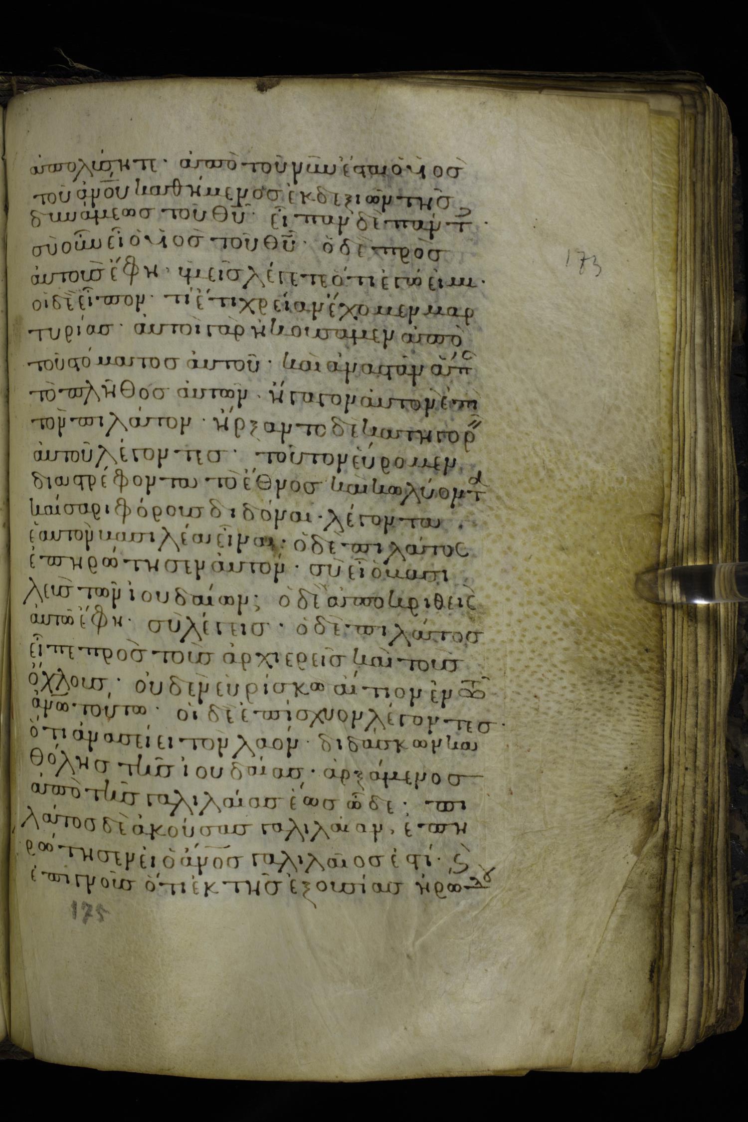 Twelfth century minuscule of the Gospels on parchment; 230 leaves, 1 column, 24-26 lines per column. Images were taken at the National Library of Greece in Athens.