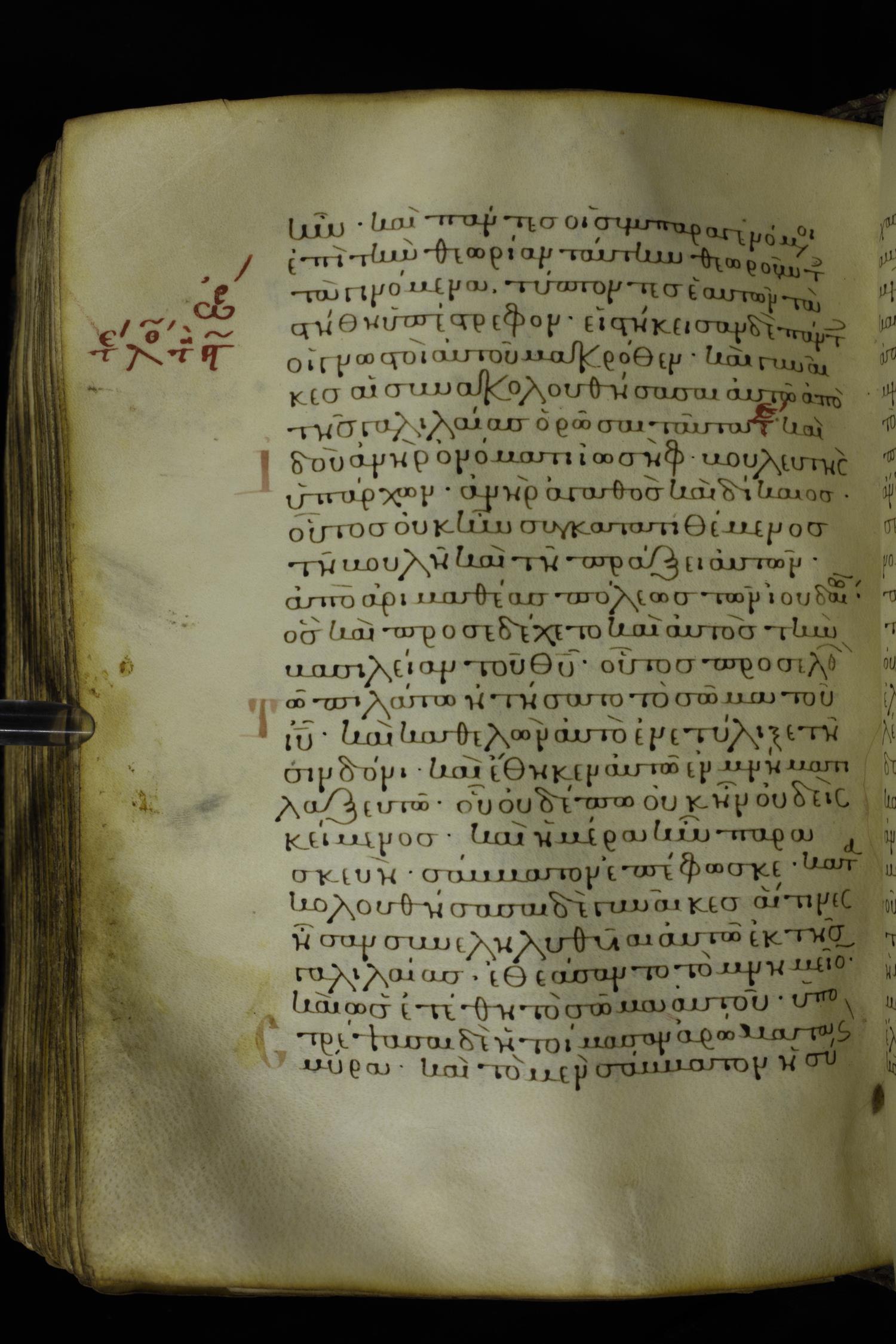 Twelfth century minuscule of the Gospels on parchment; 230 leaves, 1 column, 24-26 lines per column. Images were taken at the National Library of Greece in Athens.