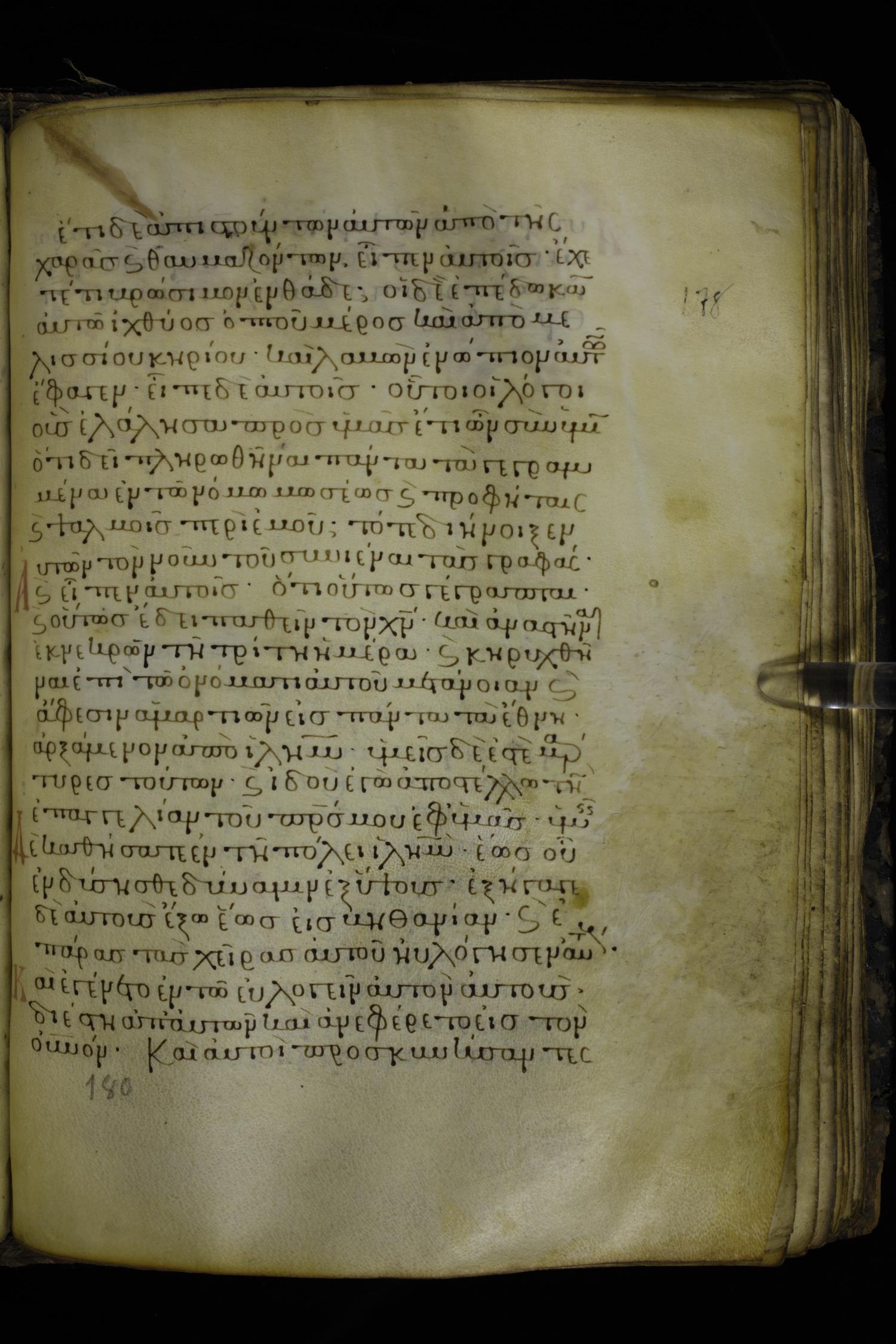 Twelfth century minuscule of the Gospels on parchment; 230 leaves, 1 column, 24-26 lines per column. Images were taken at the National Library of Greece in Athens.