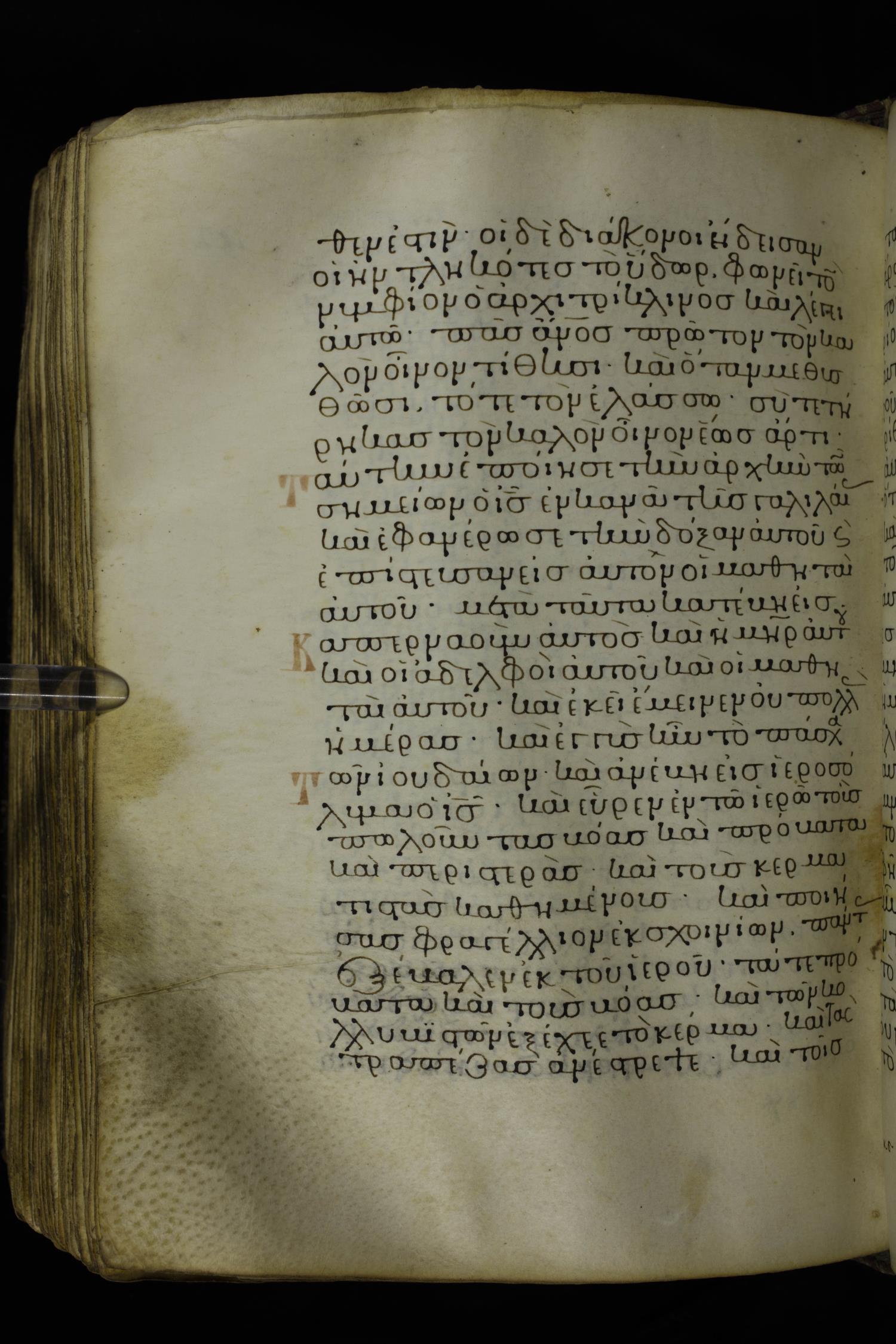 Twelfth century minuscule of the Gospels on parchment; 230 leaves, 1 column, 24-26 lines per column. Images were taken at the National Library of Greece in Athens.