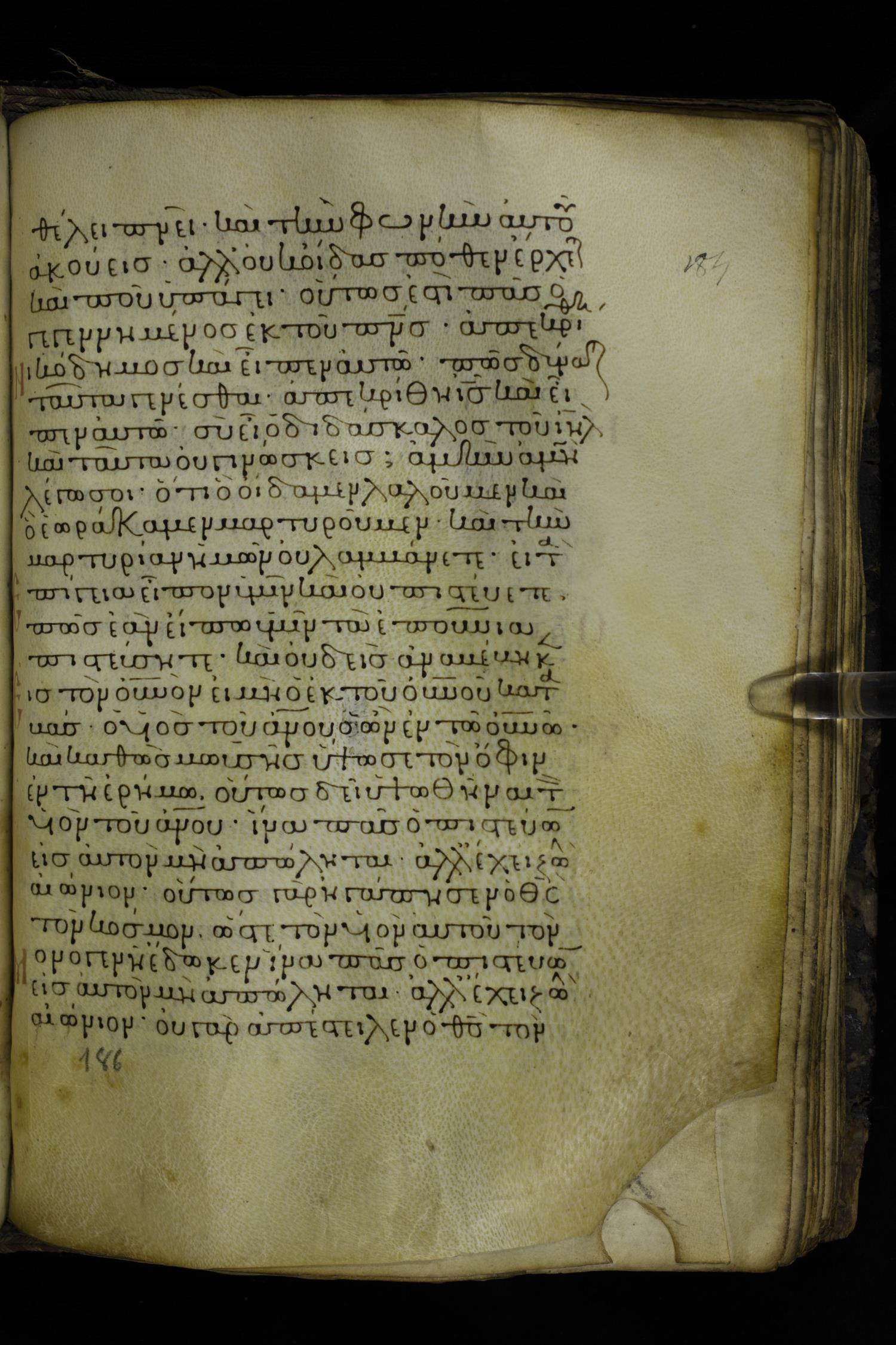Twelfth century minuscule of the Gospels on parchment; 230 leaves, 1 column, 24-26 lines per column. Images were taken at the National Library of Greece in Athens.