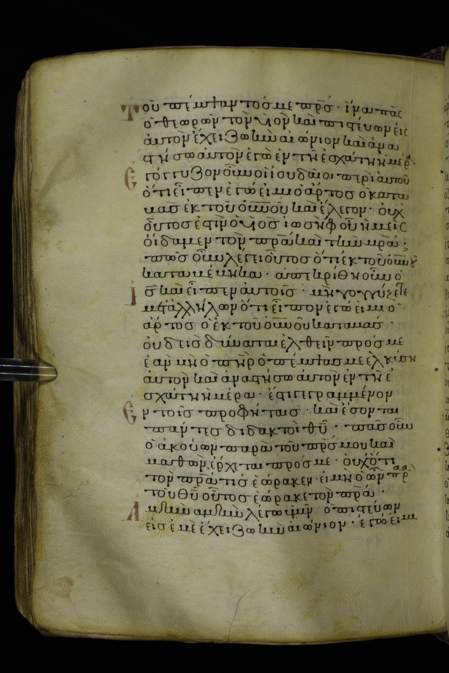 Twelfth century minuscule of the Gospels on parchment; 230 leaves, 1 column, 24-26 lines per column. Images were taken at the National Library of Greece in Athens.