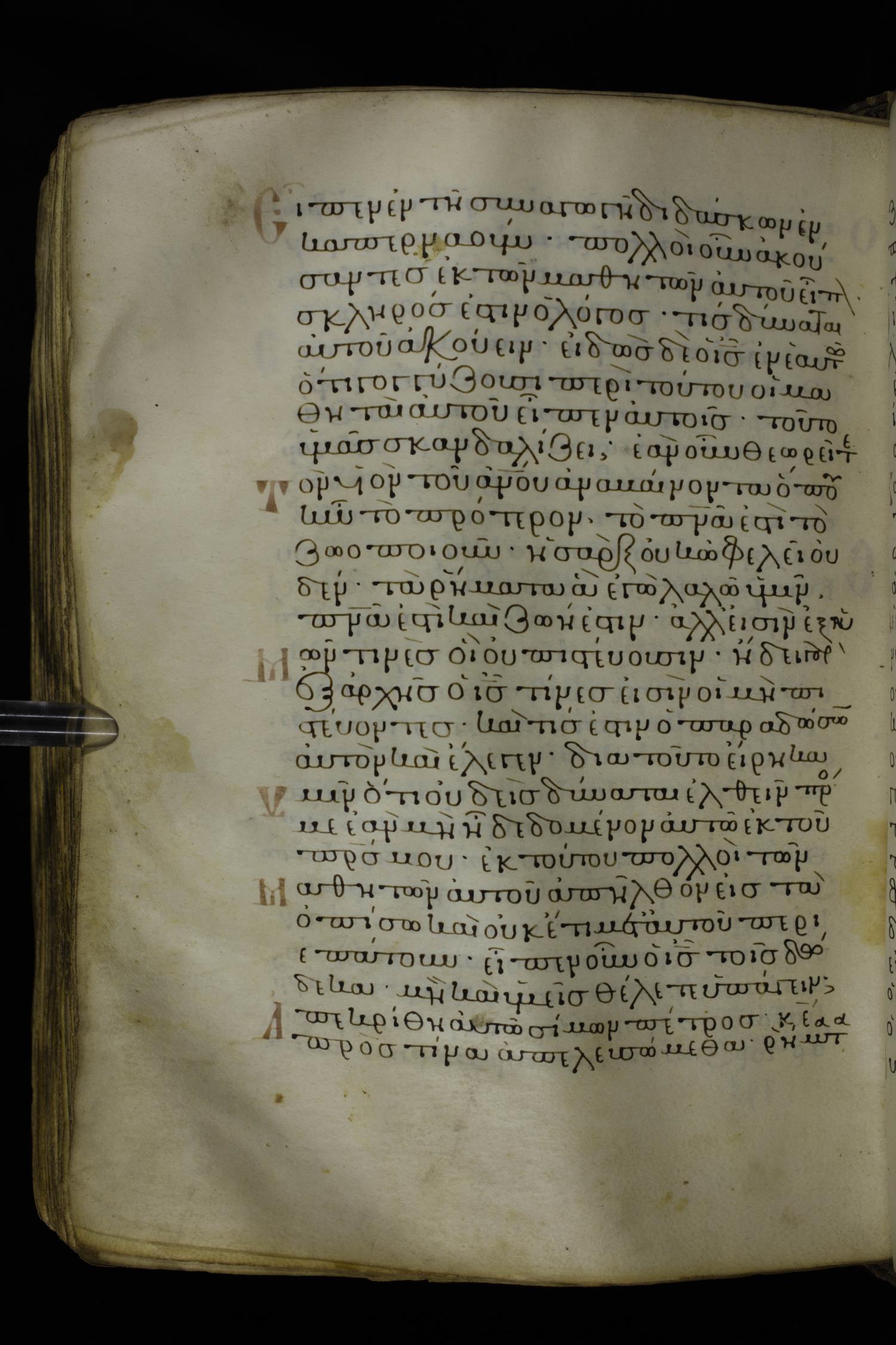 Twelfth century minuscule of the Gospels on parchment; 230 leaves, 1 column, 24-26 lines per column. Images were taken at the National Library of Greece in Athens.