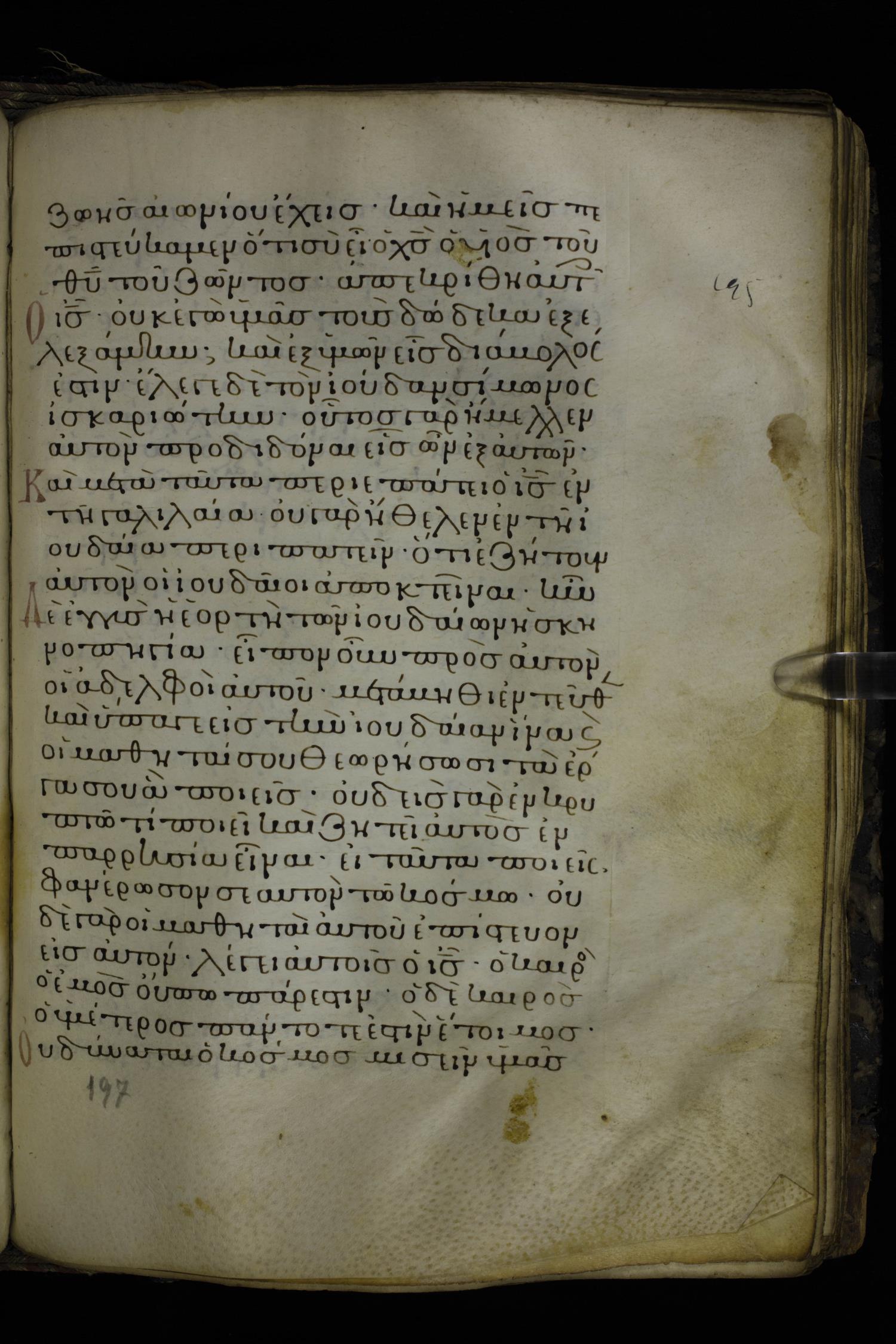 Twelfth century minuscule of the Gospels on parchment; 230 leaves, 1 column, 24-26 lines per column. Images were taken at the National Library of Greece in Athens.