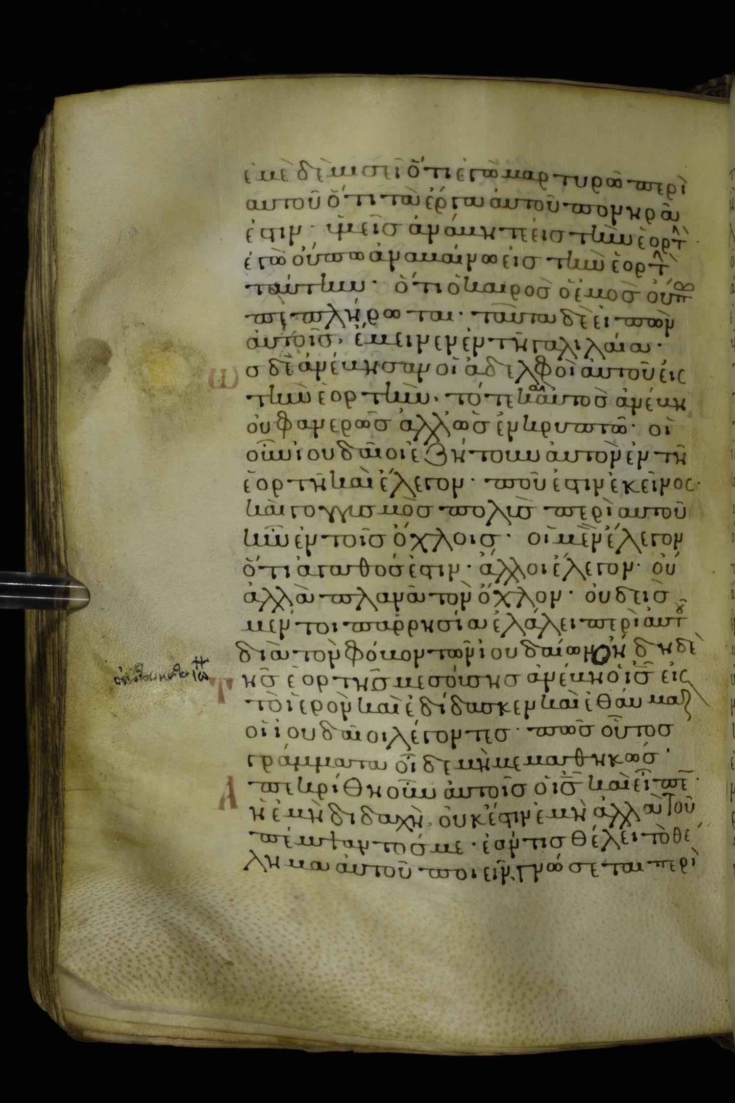 Twelfth century minuscule of the Gospels on parchment; 230 leaves, 1 column, 24-26 lines per column. Images were taken at the National Library of Greece in Athens.