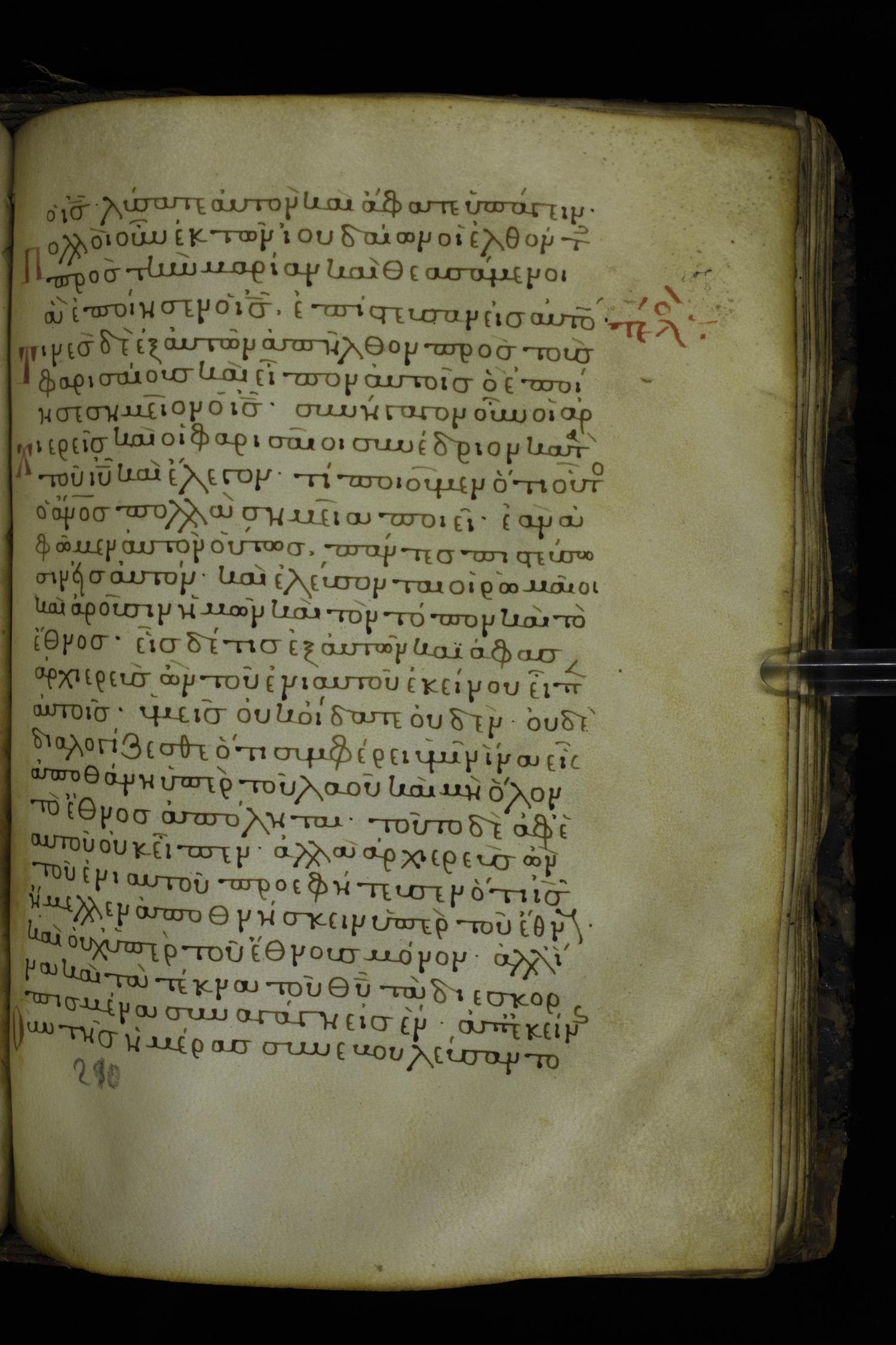 Twelfth century minuscule of the Gospels on parchment; 230 leaves, 1 column, 24-26 lines per column. Images were taken at the National Library of Greece in Athens.