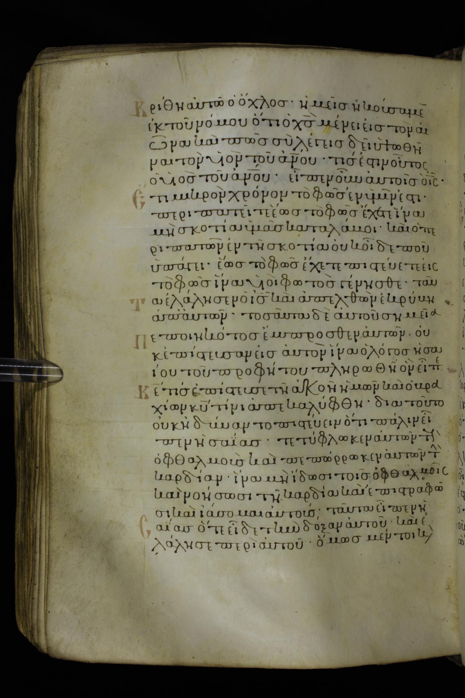 Twelfth century minuscule of the Gospels on parchment; 230 leaves, 1 column, 24-26 lines per column. Images were taken at the National Library of Greece in Athens.