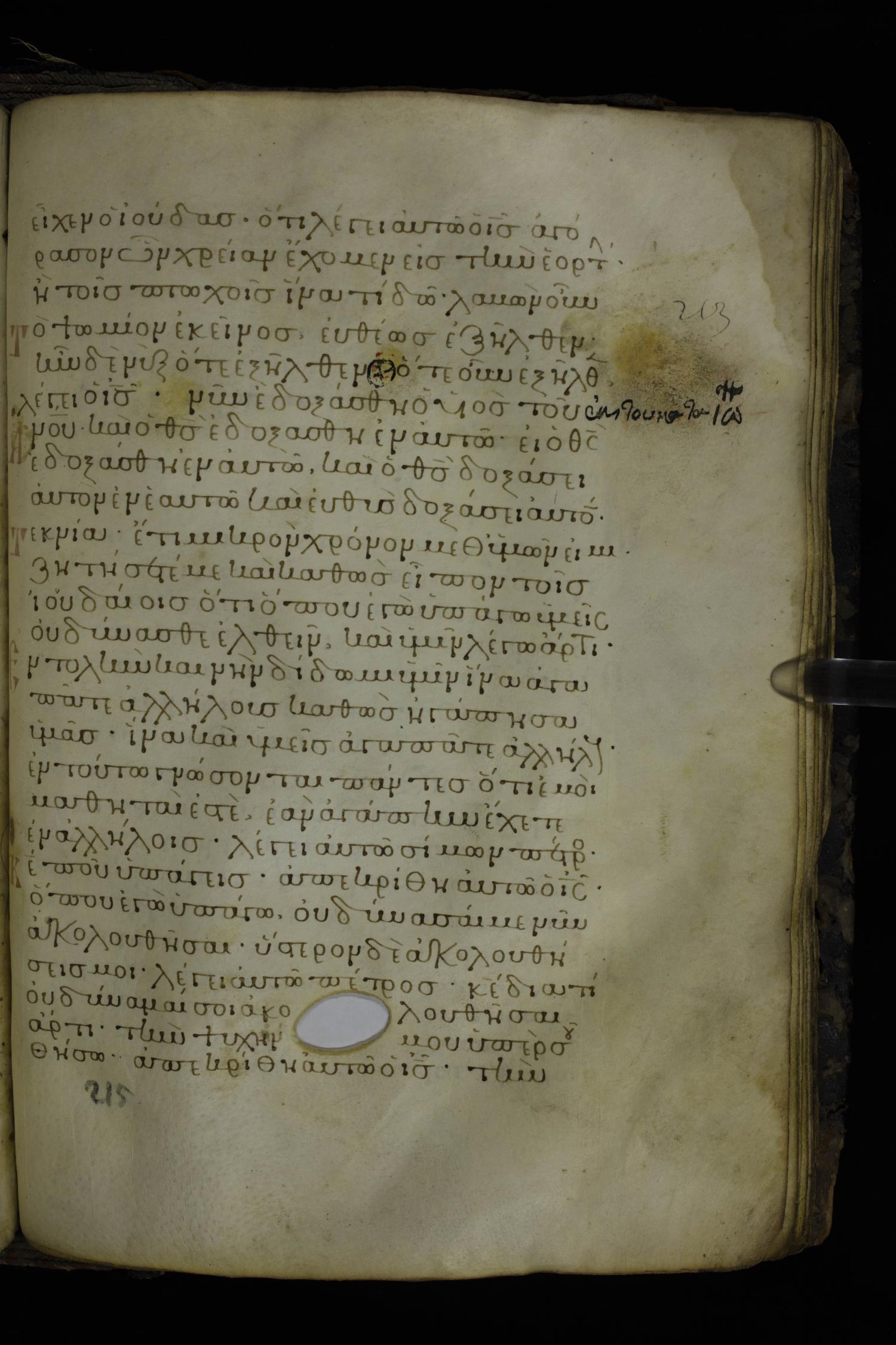 Twelfth century minuscule of the Gospels on parchment; 230 leaves, 1 column, 24-26 lines per column. Images were taken at the National Library of Greece in Athens.