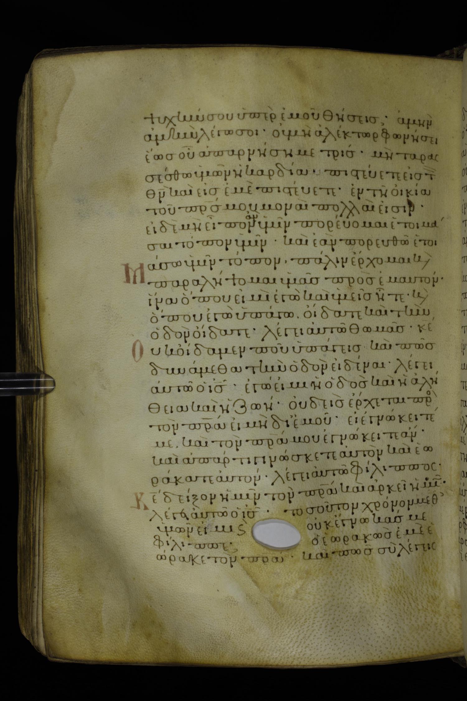 Twelfth century minuscule of the Gospels on parchment; 230 leaves, 1 column, 24-26 lines per column. Images were taken at the National Library of Greece in Athens.