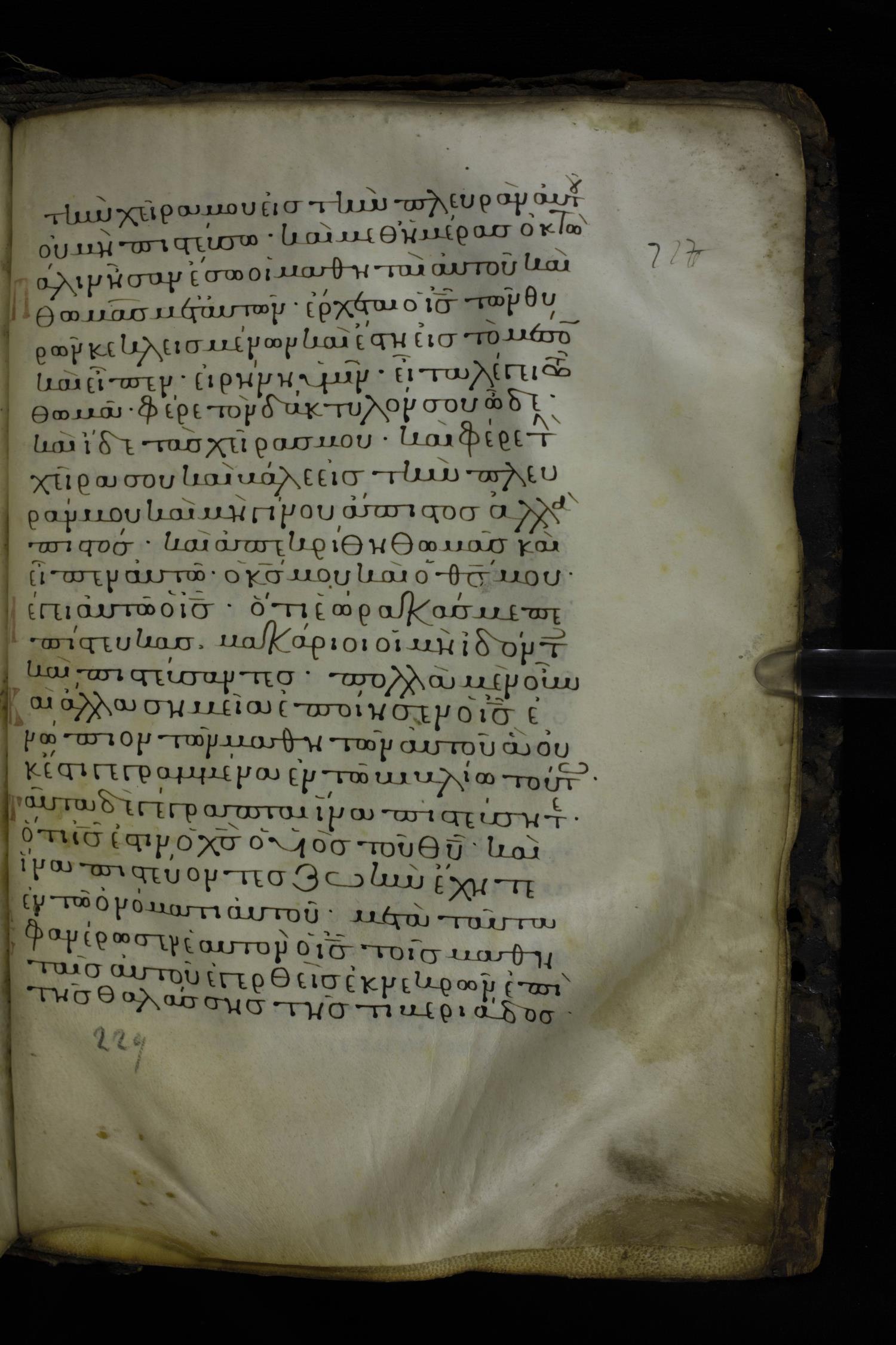 Twelfth century minuscule of the Gospels on parchment; 230 leaves, 1 column, 24-26 lines per column. Images were taken at the National Library of Greece in Athens.