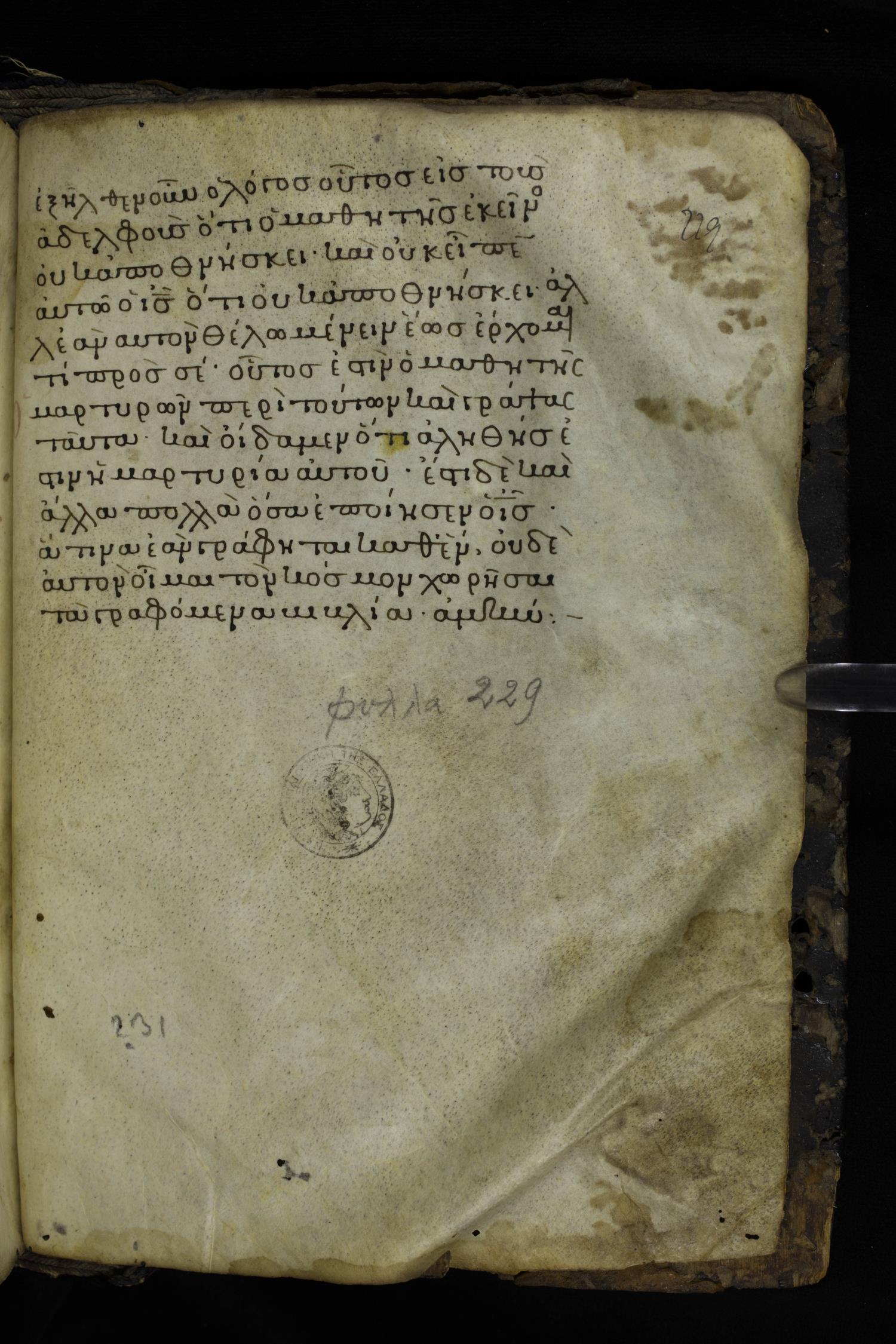 Twelfth century minuscule of the Gospels on parchment; 230 leaves, 1 column, 24-26 lines per column. Images were taken at the National Library of Greece in Athens.