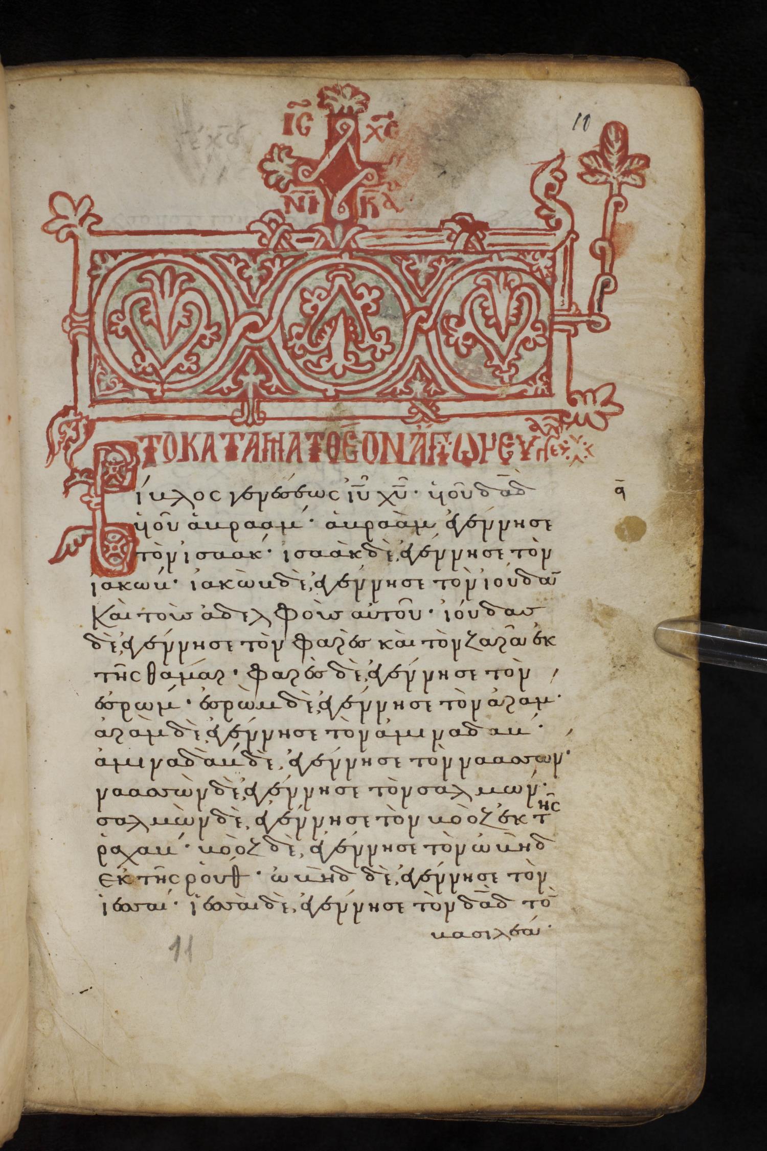 Thirteenth century minuscule of the Gospels on parchment; 237 leaves, 1 column, 23 lines per column. Images were taken at the National Library of Greece in Athens.