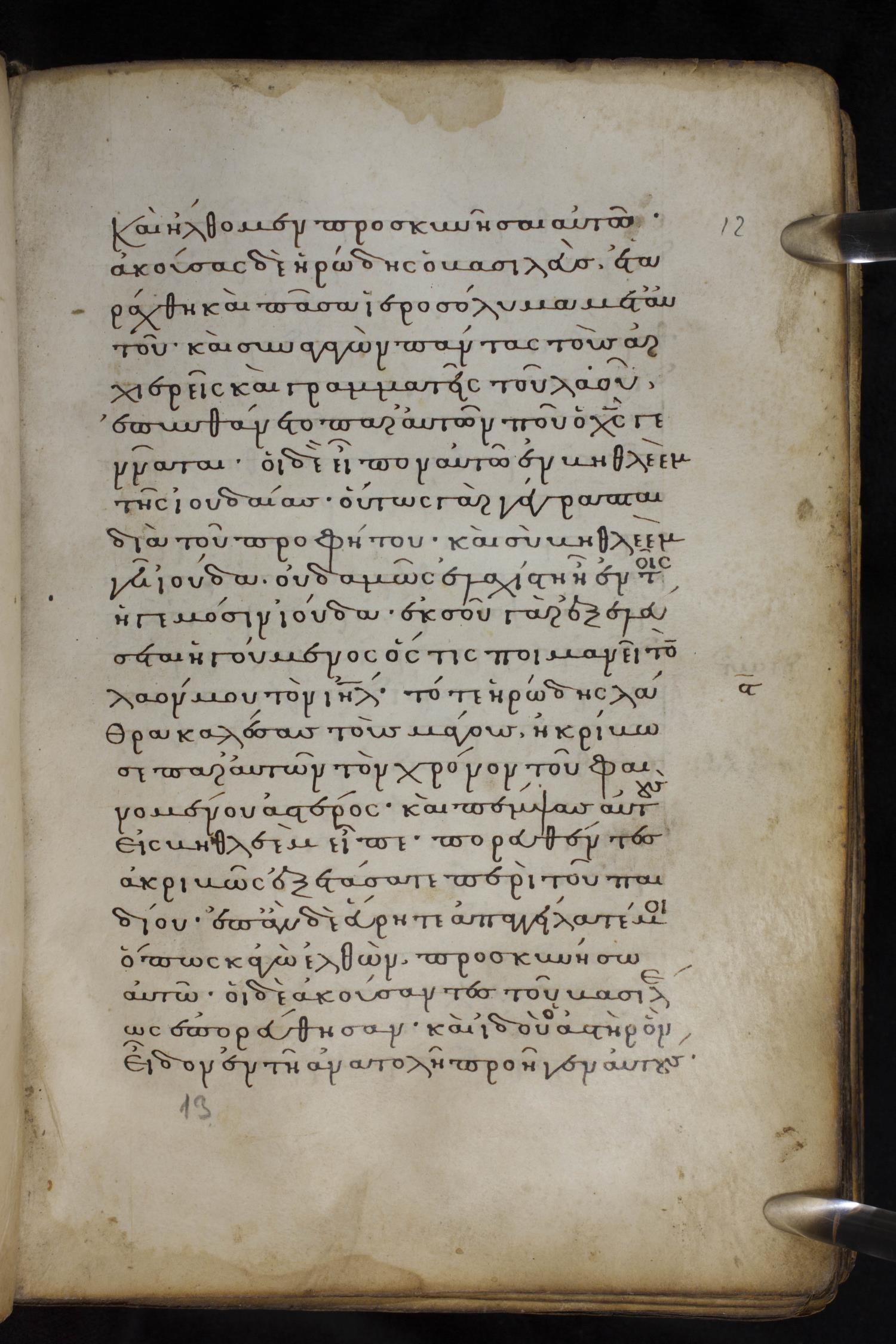 Thirteenth century minuscule of the Gospels on parchment; 237 leaves, 1 column, 23 lines per column. Images were taken at the National Library of Greece in Athens.