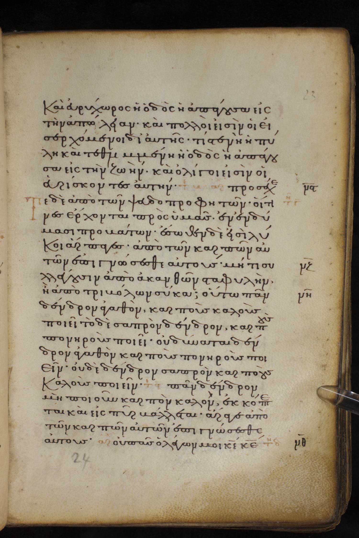 Thirteenth century minuscule of the Gospels on parchment; 237 leaves, 1 column, 23 lines per column. Images were taken at the National Library of Greece in Athens.