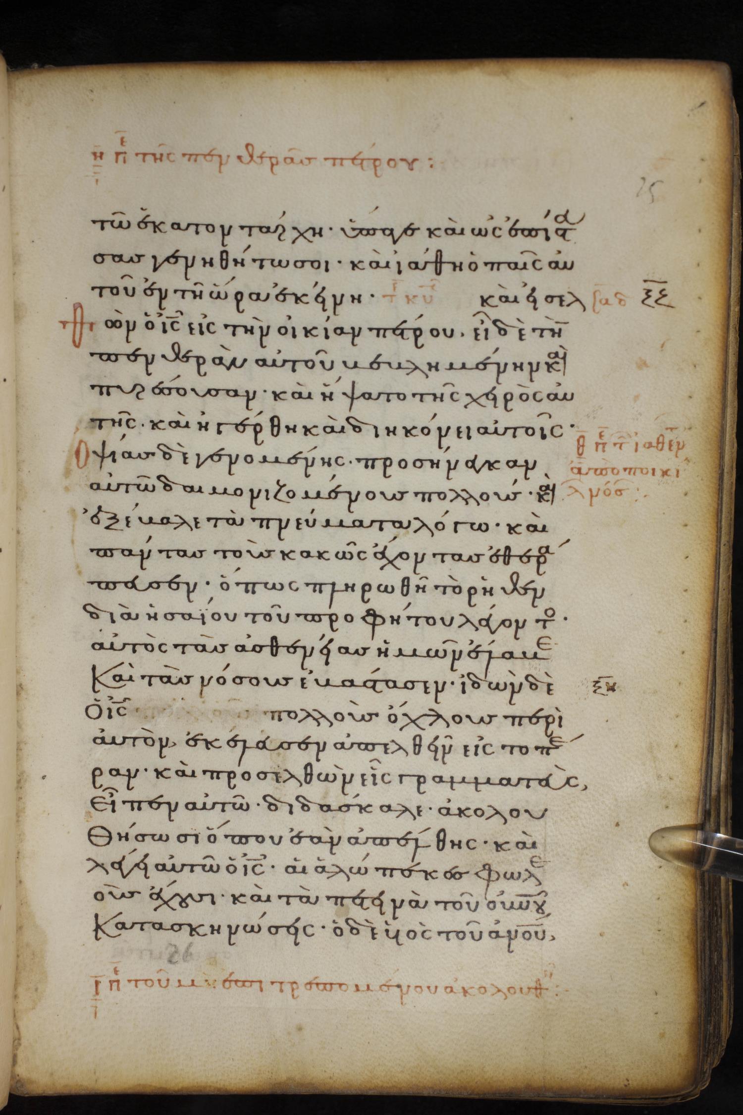 Thirteenth century minuscule of the Gospels on parchment; 237 leaves, 1 column, 23 lines per column. Images were taken at the National Library of Greece in Athens.