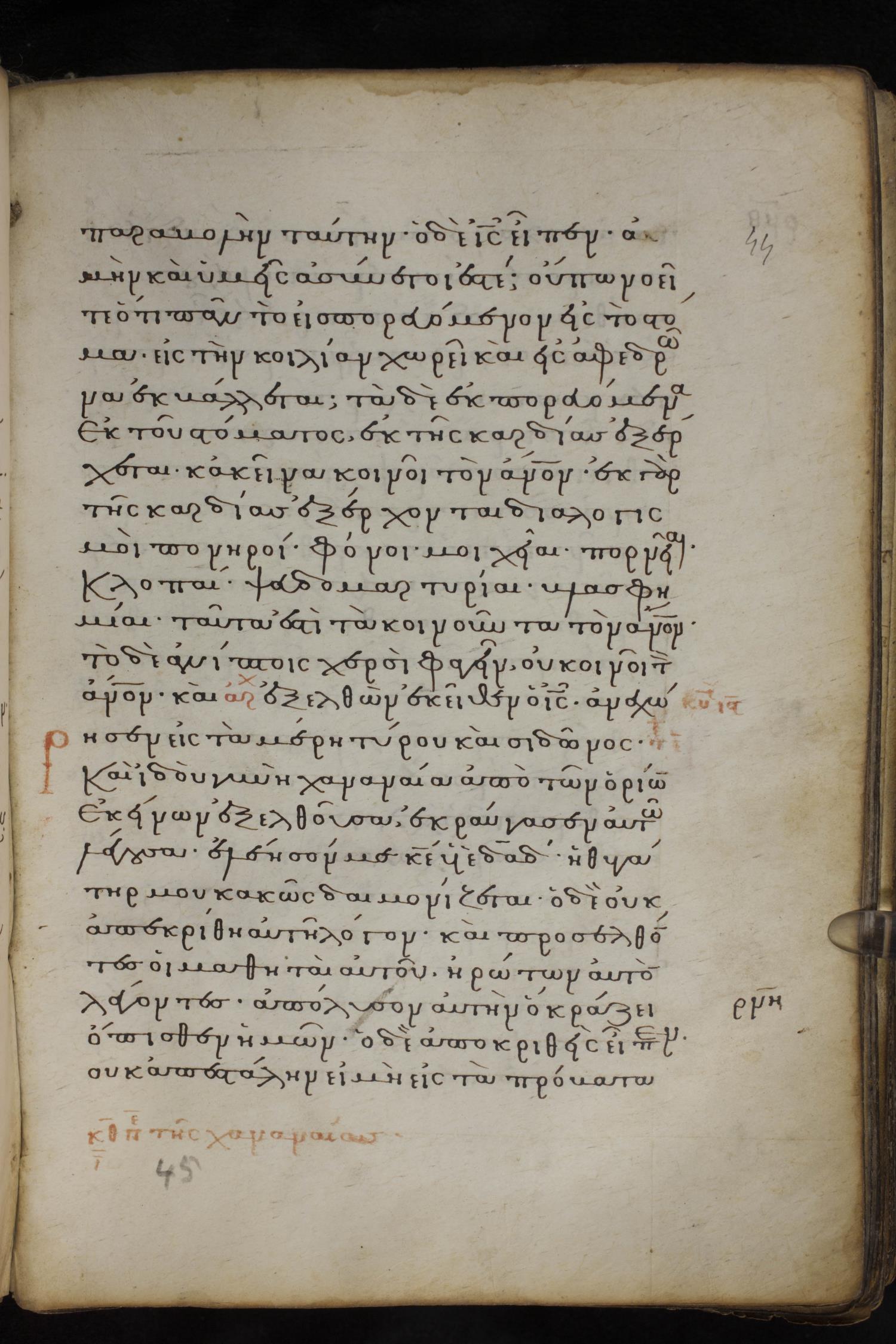 Thirteenth century minuscule of the Gospels on parchment; 237 leaves, 1 column, 23 lines per column. Images were taken at the National Library of Greece in Athens.