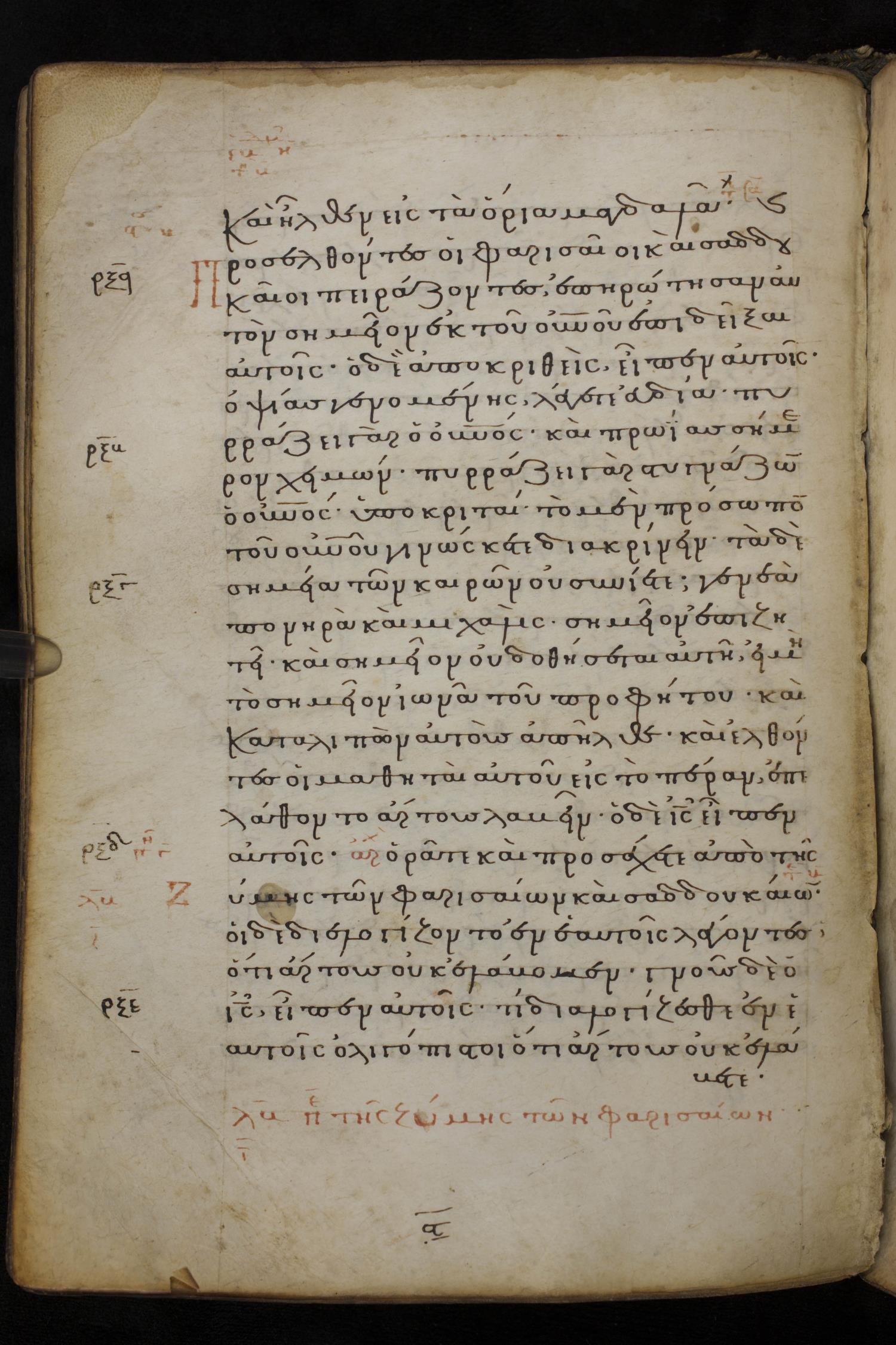 Thirteenth century minuscule of the Gospels on parchment; 237 leaves, 1 column, 23 lines per column. Images were taken at the National Library of Greece in Athens.
